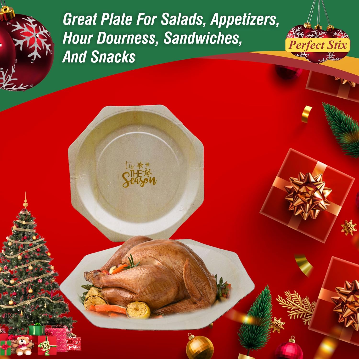 11" Octagon shape plates with Tis the Season printed in Gold. Our package includes 30 plates made from high quality wood. Package comes with 30 plates that are perfect for all holiday celebrations such as Christmas and New Years parties. Plates are dinner size and very sturdy.