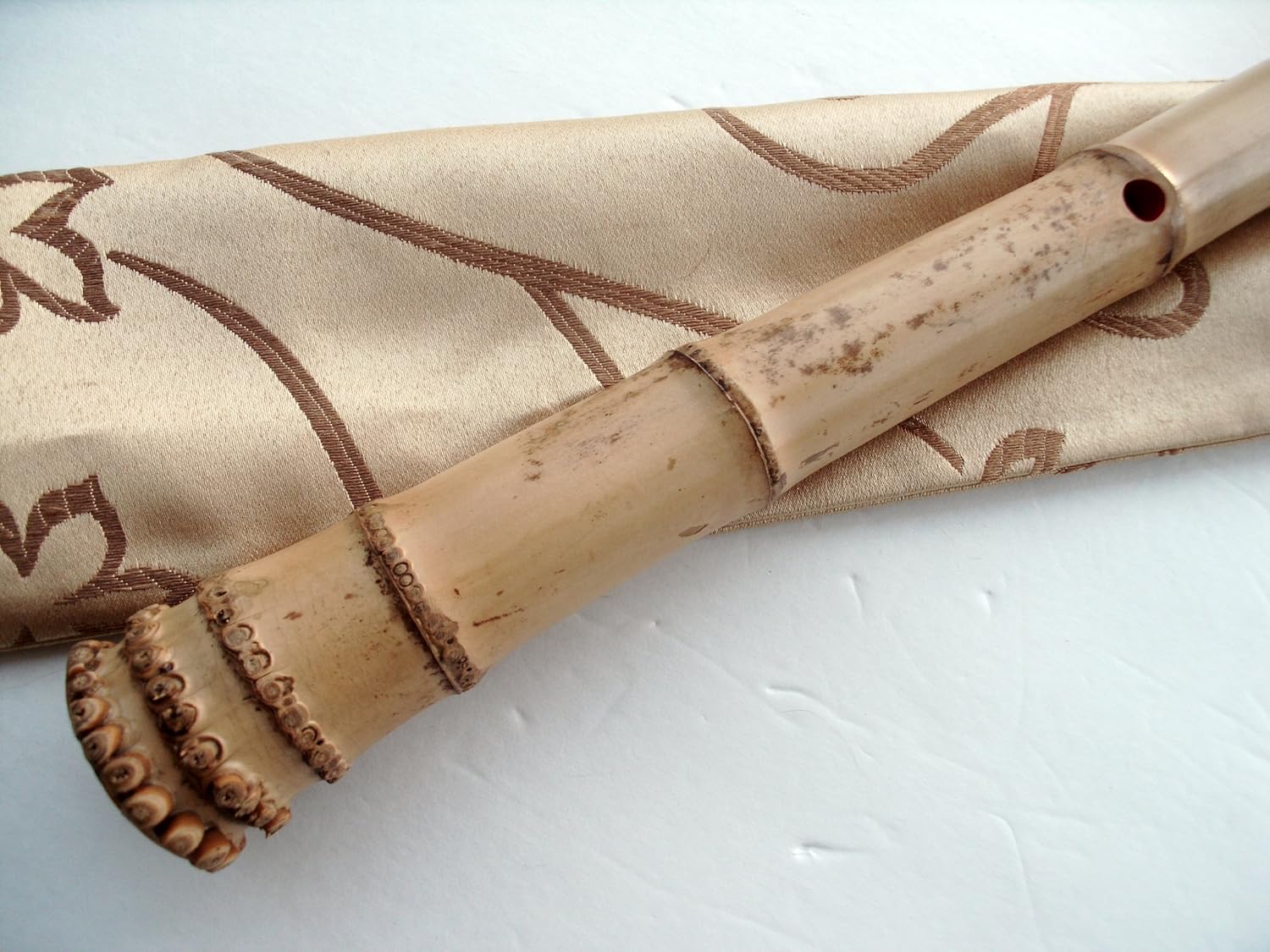 1.3 Shakuhaci. Traditional Zen Pentatonic shkauhachi which is 1.3 feet in length ( Japanese feet). w. Kinko style voicing hole Utaguji. Number of nodes is 6. Weight: 270 g ( 9.6 Oz ). Length: 15 1/2 inches ( US inches ). Total of 7 bamboo joints. Comes with one thick satin fabric sleeve bag ( as shown in the picture ). **Note : Pictures shown is a sample one from my stock. The one, when you purchased, that will be shipped to you should be the same quality, same model as the pictured one you saw in this listing. As all the shakuhachi were all hand-made and they were NOT identical in terms of its outer appearance which means the number of joints, the positioning of the holes, the vein and grains of the body should be looked different from one to the other. So I hope the buyer has this understanding beforehand. **