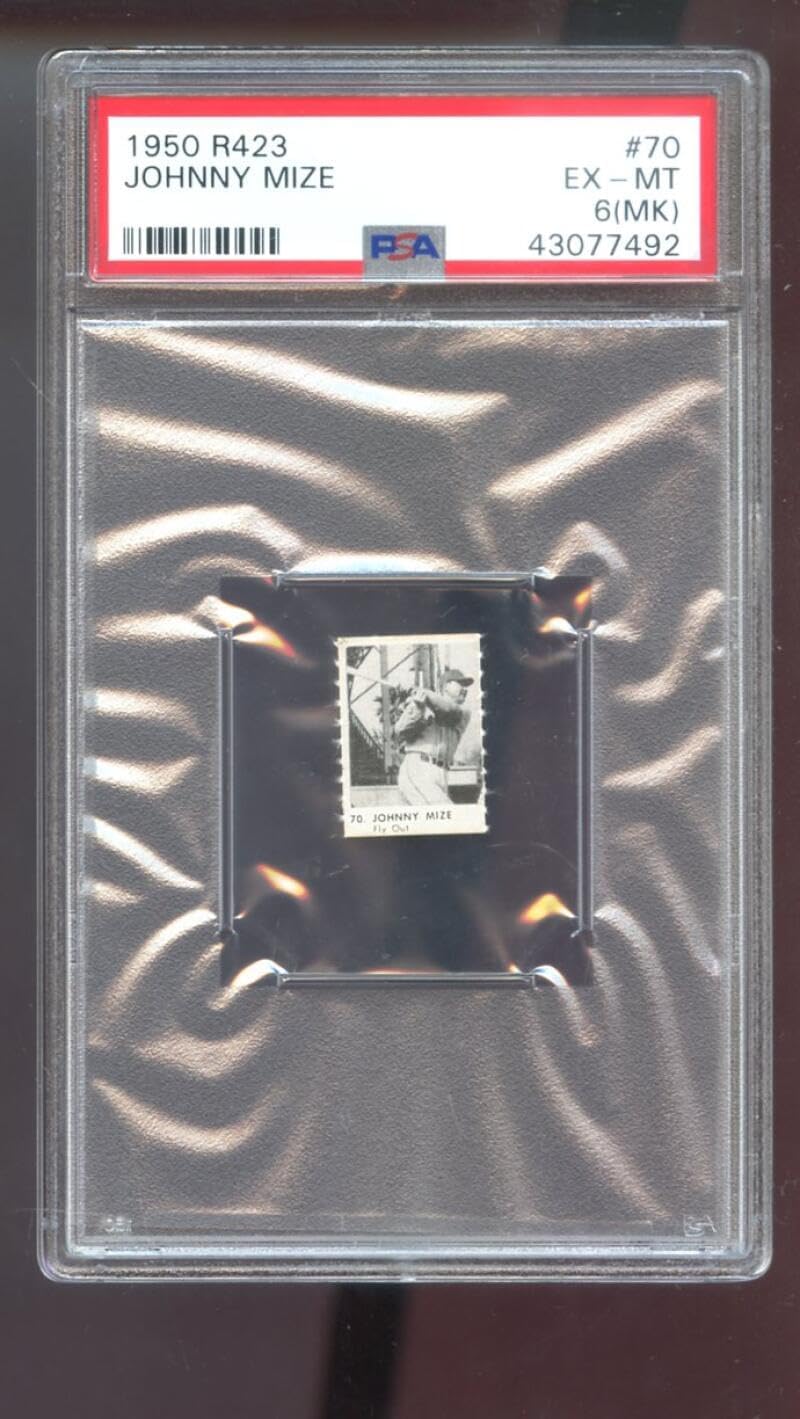 1950 R423 #70 Johnny Mize John Mize PSA 6 (MK) Graded Baseball Card MLB Game Strip Orange Back. This listing is for a 1950 R423 #70 Johnny Mize John Mize MLB Graded Baseball Card graded by PSA as a PSA EX-MT 6 (MK). The card is shown in the first scan. The back of the card is shown in the second scan. PLEASE NOTE that the card is prone to shifting in the holder. This may happen during shipment. Carefully appropriately tapping the side of the graded case can readjust the card. Great card!