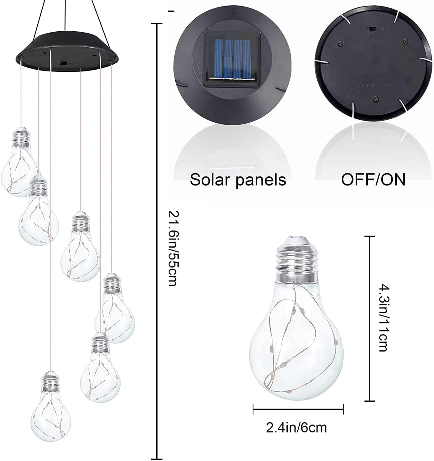 1 colorful Christmas light bulb solar wind chimes.Our color changing wind chimes is a gift for friends, mother, father, holidays. Color changes, make your decoration atmosphere more intense. Charge during the day time and glow in night. Our Christmas LED wind chimes lights can last up to 6 - 8 hours when fully charged. Lights light up automatically at night, featuring color changing LED bulbs, and change colors in random. Ideal for lawn, porch, garden, patio, yard, hall, roof, living room, bedroom, porch, patio etc. Warm notice: Leave the switch to "ON" position. Keep the solar panel clean and direct sunlight. Select an outdoor location which away from other light source at night, such as street lights. Or It may not turn on automatically at night. The light sensor is very sensitive and make sure the solar panel is not expose in light. Duration of light depends on solar product's level of sunlight exposure, geographical locations, weather conditions and the length of daytime.