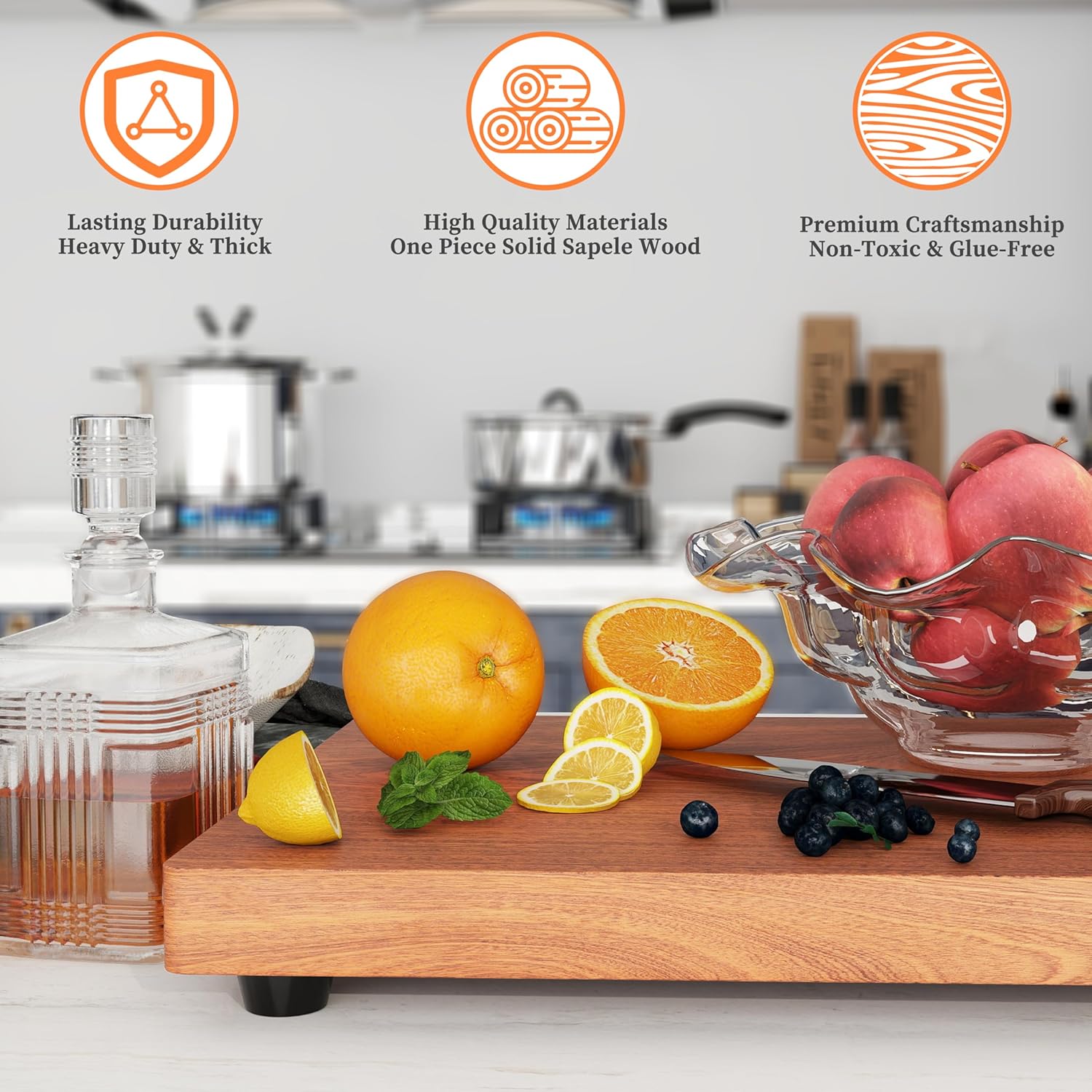 Enhance your kitchen with the Brosisincorp Magnetic Knife Block & Solid Sapele Wood Cutting Board Bundle - the ultimate combination for stylish storage and efficient food preparation. The magnetic knife block, measuring 9.74.54.5 inches, is made from high-quality acacia wood and stainless steel, providing a durable and visually pleasing construction. It features three rows of magnets on all four sides, ensuring a firm hold and easy access to your knives with its 360° rotatable design. The included removable food-grade bristle cartridge makes maintenance a breeze. Complementing the knife block is the solid sapele wood cutting board, a large and heavy-duty addition to your kitchen tools. Measuring 15.74"L x 11.81"W x 1.18"H, this cutting board is made from premium organic sapele log wood, sanded and polished to a smooth finish. Its edge grain structure and non-slip rubber feet ensure stability during use, while the stainless steel handle adds convenience for storage and portability. This bundle is not just functional; it's also a beautiful addition to your kitchen decor. The elegant gift box presentation makes it a thoughtful idea for family and friends who love to cook. Whether you're a home chef or a food enthusiast, the Brosisincorp Magnetic Knife Block & Solid Sapele Wood Cutting Board Bundle offers an innovative and convenient solution to elevate your kitchen game while keeping your utensils organized and at arm's reach.