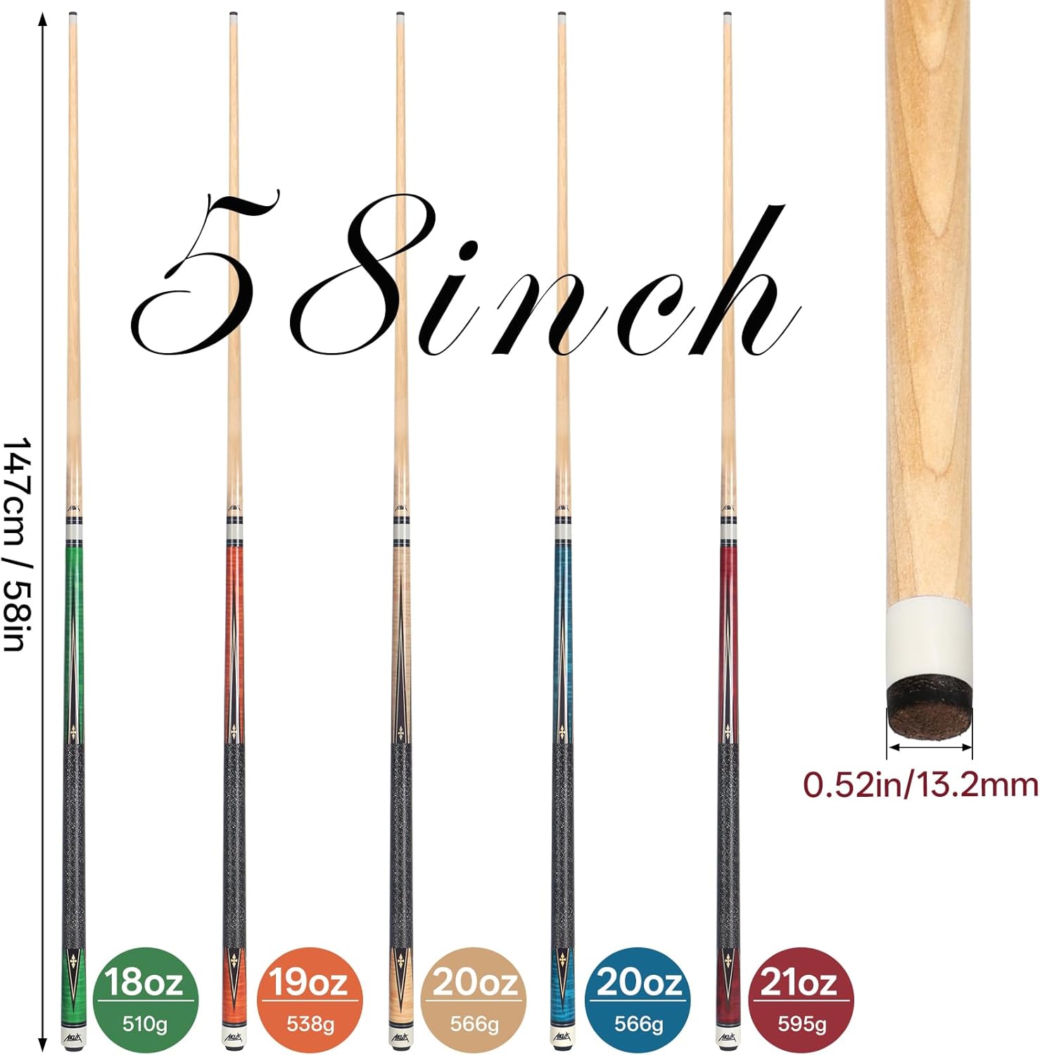 AKLOT Pool Cue Sticks, 58" Canadian Maple Professional Pool Sticks for Adults Set of 5,Billiards Cue Sticks for Home, Pool Que Tacos De Billar, 18~21oz Multiple Colors