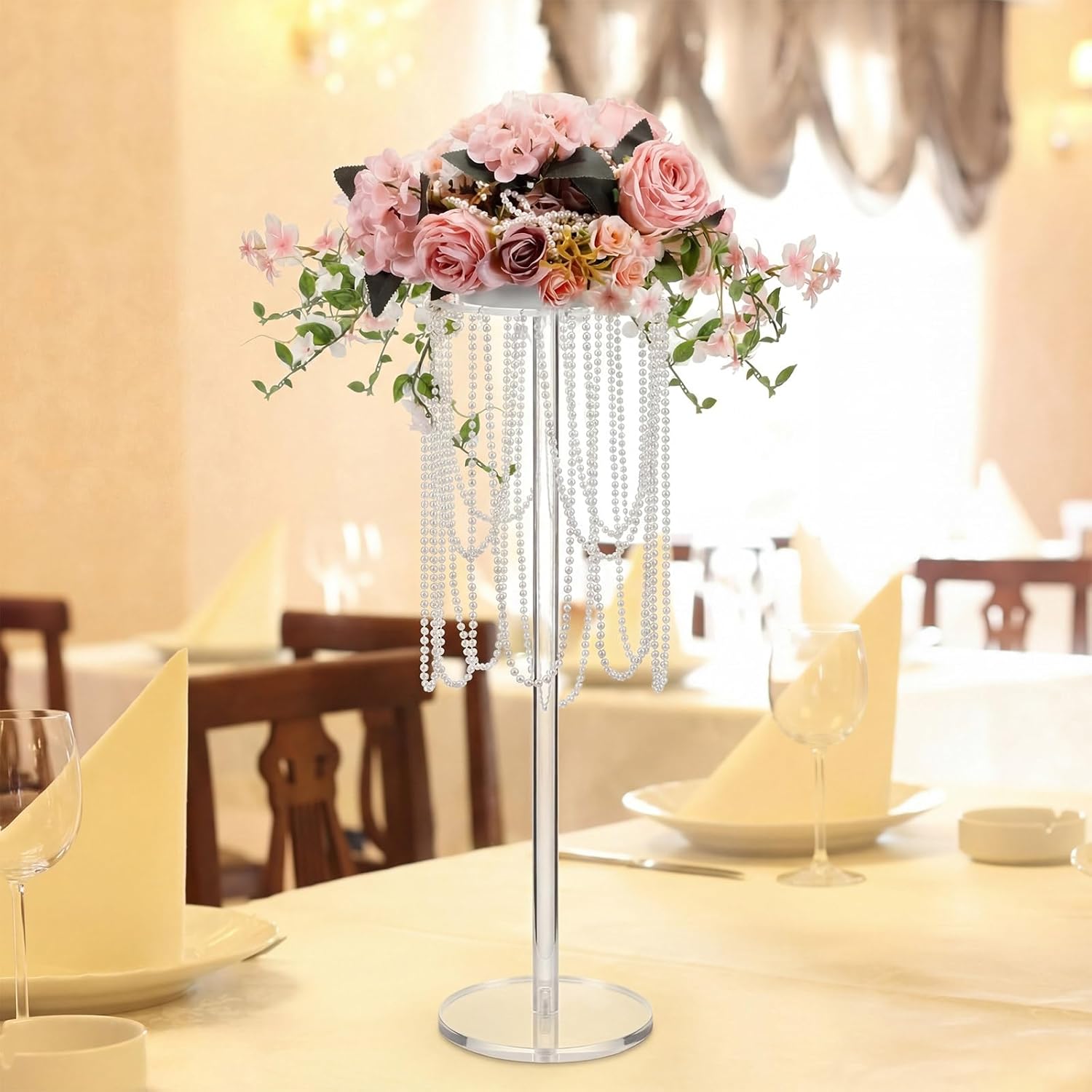 Features: Reusable for Cost Savings: unlike disposable decor, the sturdy acrylic holders and durable pearl chain can be reused. After weddings, use them for anniversary dinners, holiday parties, or home decor (e. G. , holding small plants). Saves money on new decor and reduces waste. Perfect Height for Guest Comfort: at 23.6'' tall, centerpieces attract attention without blocking guests' views during meals. Transparent acrylic keeps tables light (not heavy), and ivory pearls add soft luxury. Makes tables well-decorated but not cluttered, impressing guests. Specifications: Material: acrylic Color: ivory White Size: 23.6'' /60cm total height per stand Package includes: 10 x Acrylic Flower Stands 3 x Pearl Chains Notes: Manual measurement, please allow slight errors on size. The color may exist a slight difference due to different screen displays.