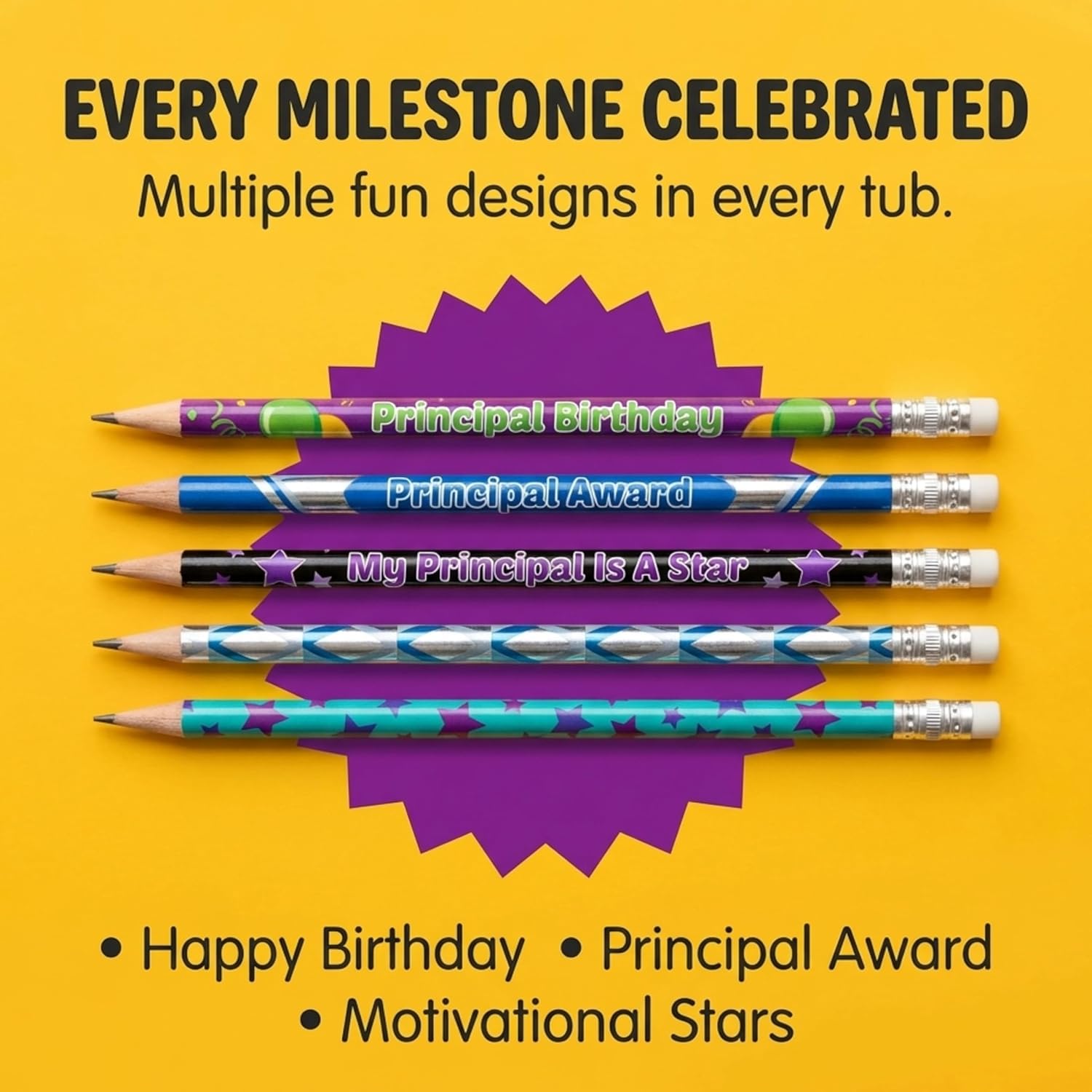 This Principal Designs Pencil Tub is a delightful addition to any school, ensuring you have enough pencils to last the entire school year! Imagine the excitement on students' faces as they receive these festive pencils, perfect for all ages, from elementary school to high school. The convenient pencil tub includes 144 standard size #2 lead pencils in assorted holographic "Principal" designs, such as "Principal Award" and "Happy Birthday from Your Principal." Picture the joy and pride as exemplary students are rewarded with a pencil on a weekly or monthly basis, recognizing their hard work and achievements. Add a pencil to gift bags for a Principal's Award presentation, creating memorable moments that students will cherish. Let students choose their own pencil from the tub when they earn a "Principal's Award," fostering a sense of accomplishment and motivation. Students will love using their pencils for daily note-taking, classwork, tests, homework, and journals. Imagine a classroom filled with students eagerly writing with their special pencils, feeling appreciated and encouraged. The Principal Designs Pencil Tub is perfect for creating a positive and fun atmosphere, appropriate for students of all ages, from elementary school classrooms to high school classrooms.