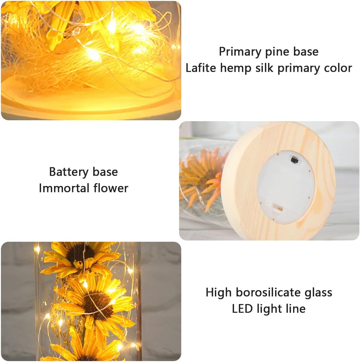 Parts List:1 X Sunflower in Glass Dome OrnamentSpecification:Product Name: Artificial Sunflower in Glass DomeMaterial: High Borosilicate Glass, Dried Flowers, Solid Wood BaseColor: Yellow RedSize:Height with Base: 23 cm /9.1 inchesHeight without Base: 21 cm /8.3 inchesBase Diameter: 11.5 cm /4.5 inches Glass Cover Diameter: 9 cm / 3.5 inchesPower Supply: 3*AAA battery (not included)The Meaning of Sunflower:1.Lovers: The flower language of sunflower is ""silent love, unspoken love"", which represents the brave pursuit of the happiness you want. It is sunny and brilliant, love is magnanimous, love is inseparable, and has its own unique charm.2.Classmates or friends: Sunflower is a vibrant flower, representing vitality and sunshine, pursuing a positive life, always maintaining a positive attitude, and full of love for dreams and life. Express your blessings and encouragement.3.Teacher: Sunflowers are flowers that grow toward the sun. They follow the sun's rays firmly and persistently. It means that they shine in your heart and guide you. At the same time, it also expressed your gratitude.4.Parents or other elders: the golden flowers of sunflowers represent warmth and health, just like the warm love given to us by parents and elders. Send sunflowers to them, thank them for their enthusiastic care, and wish them good health.Notes:1.Due to the difference between different monitors, the picture may not reflect the actual color of the item.2.Please allow slight dimension difference due to different manual measurement. Thank you for your understanding.