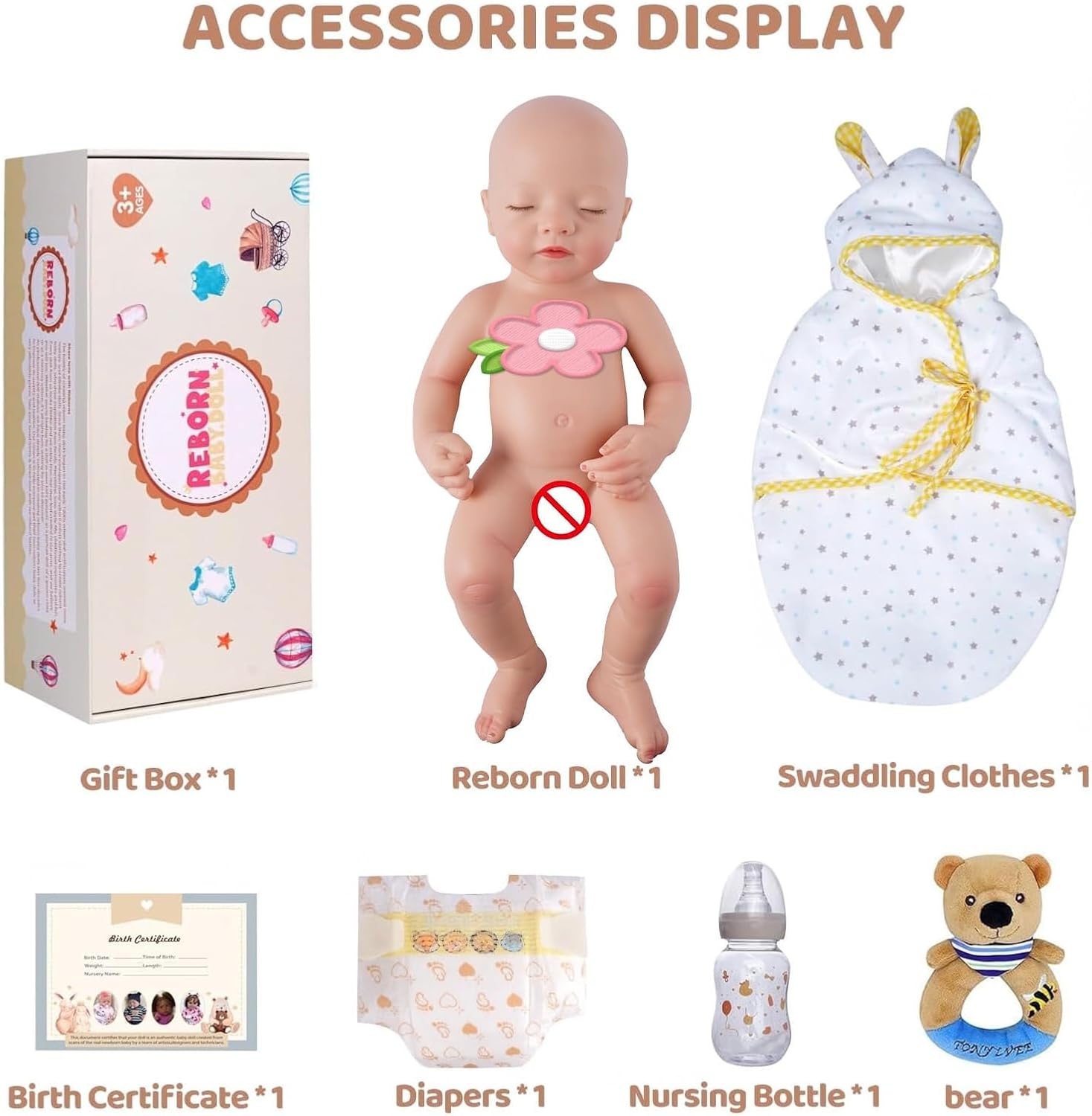| Included Components | Birth certificate × 1, Clothing set × 1, Gift box × 1, Nursing Bottle × 1, Reborn doll × 1 |