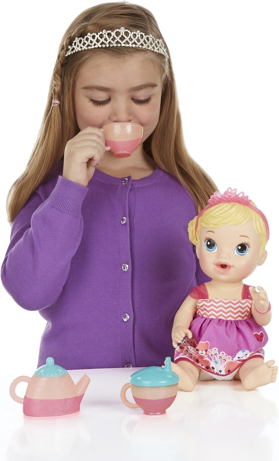 Give your little girl the fun of real babies with the Lil' Sips Baby Has a Tea Party doll! This little doll drinks and wets just like a real baby. Your little one will love changing her, feeding her, and taking care of her just like a real mommy. She comes with all the fixings for a fancy baby tea party, even a sippy teacup! Get the party started with this Lil' Sips Baby Has a Tea Party doll! Baby Alive and all related characters are trademarks of Hasbro.