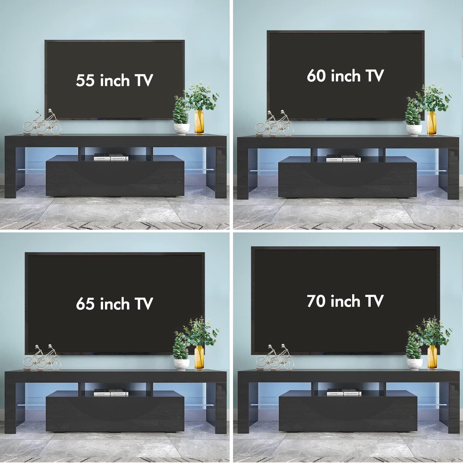 TV stand with 20-color led light and 4-lighting modes and brightness level. Equipped with remote control, it is easy to change lights. Universal tv stand can accommodate all kinds of 70-inch TVs. TV stand with storage and drawer can meet all your display and storage needs in the bedroom or living room. Main features: Features: LED lights and scratch-resistant, waterproof and easy to maintain. Material: UV high gloss coated particleboard or particleboard. Color: black/white Product size: 63×13.8×17.7 inches. Net weight: 72.75 pounds Gross weight: 77.16 pounds Load: 121.3 lbs Applicable scenes: bedroom, lounge, living room, office, etc. Each panel and installation part has a label, please find the corresponding label for installation. Includes: All parts of 1pc× TV cabinet 1pc× user manual