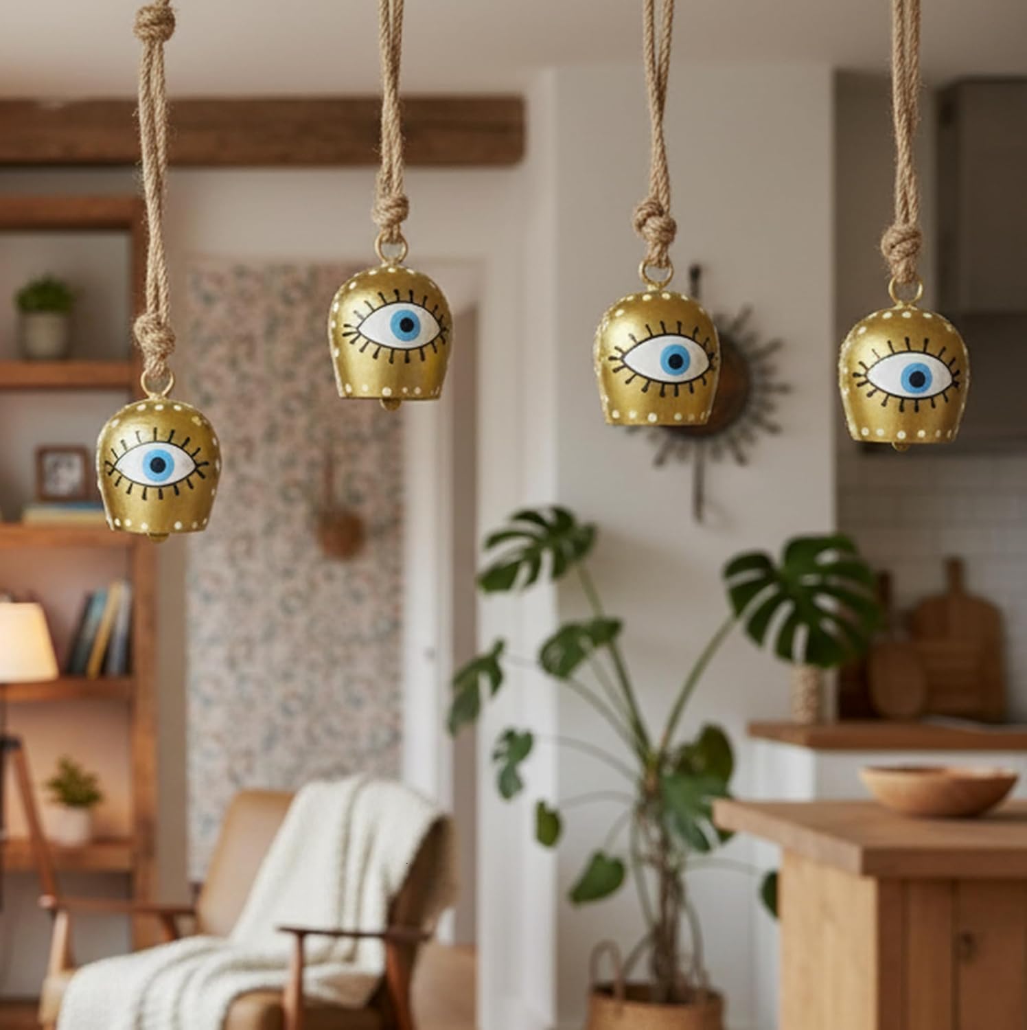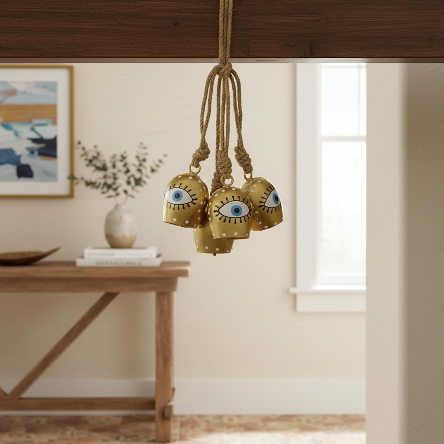 Add a touch of spiritual elegance to your home with these traditional brass hanging bells. Each decorative bell features an intricate eye design and comes with a rustic rope chain for easy wall mounting. Perfect for meditation spaces, prayer rooms, or as artistic home decor, these medium-sized bells measure 6 inches in width and 6 inches in height. The set includes five handcrafted bells, making them substantial enough to create a meaningful presence while remaining easy to install. The bells' traditional design incorporates detailed craftsmanship that brings a sense of authenticity to your indoor space. Whether used in a temple setting or as decorative pieces, these wall-mounted brass bells serve both functional and aesthetic purposes. The classic bell shape and timeless finish make them versatile additions to any room where you wish to create an atmosphere of serenity and cultural richness.