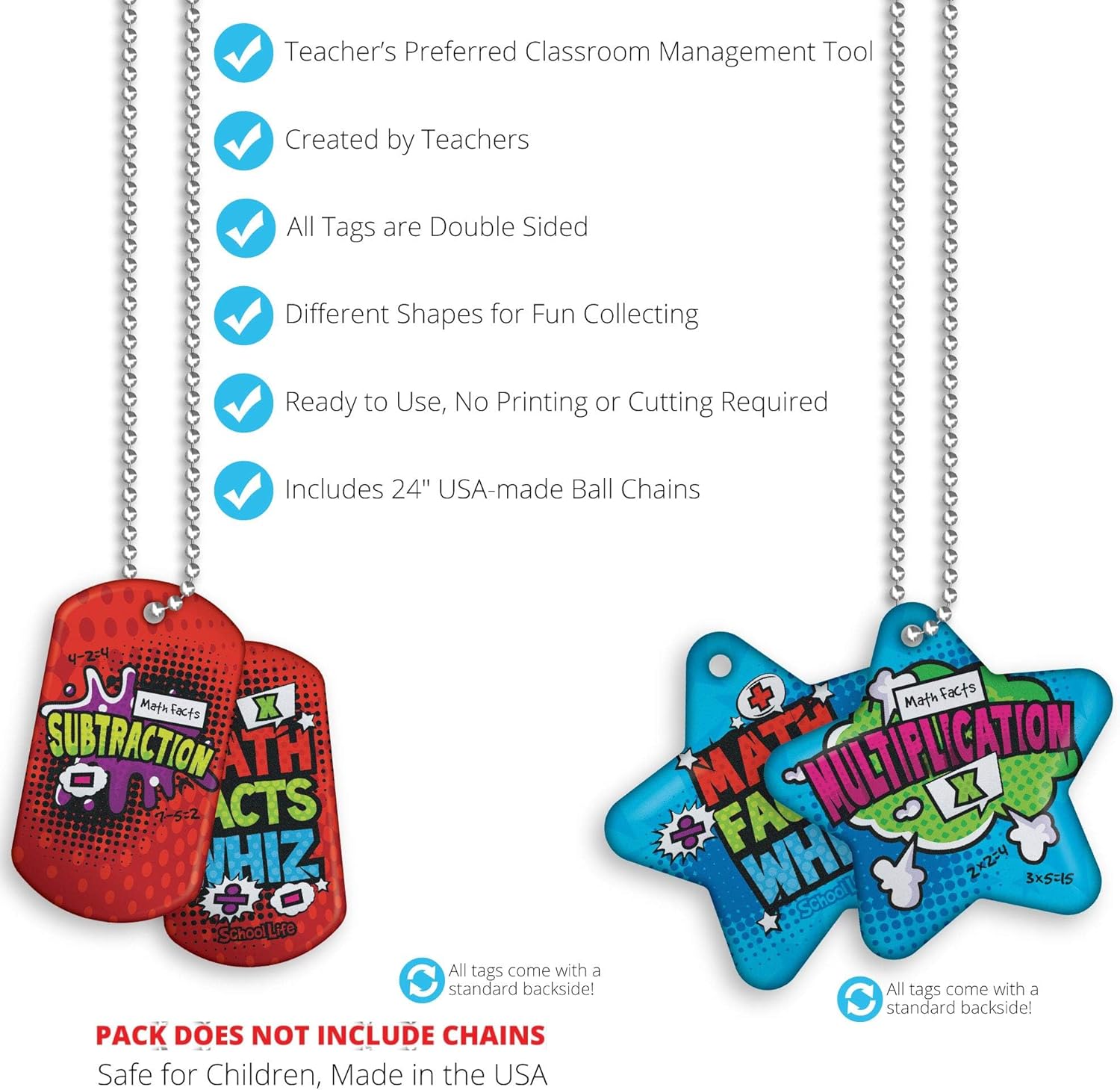 Elementary school math students love these Brag Tags. As young students learn important math skills like addition, subtraction, multiplication, division and more, Brag Tags help encourage, motivate, and strengthen their accomplishments. To solidify learning and encourage further accomplishments, award Brag Tags as milestones are reached. The Build Basic Math Skills Brag Tag Value Pack: 100 Tags (10 Tags for Each Shape) was developed and designed in California, and manufactured in Texas, by School Life. We are the home and creator of the Original Brag Tags. They make your elementary school vibrant, unique and successful by motivating, rewarding, recognizing, and inspiring your students. This special Value Pack was designed to help you start, or continue, a Brag Tag program for your school or classroom; it has different styles and shapes to make participating more appealing to your students. We create each Brag Tag to look different, colorful and unique, which makes collecting fun! For optimal classroom management, start each student with a ball chain and a brag tag. Each time a student is awarded another tag, they add it to their chain. With this wearable incentive reward system, students will soon compete to collect as many Brag Tags as possible. Click the School Life link above to discover even more Brag Tags to acknowledge and motivate young students for good behavior, school attendance, academic success, honor roll, classroom dojo, PBIS Rewards, reading, science, and more.