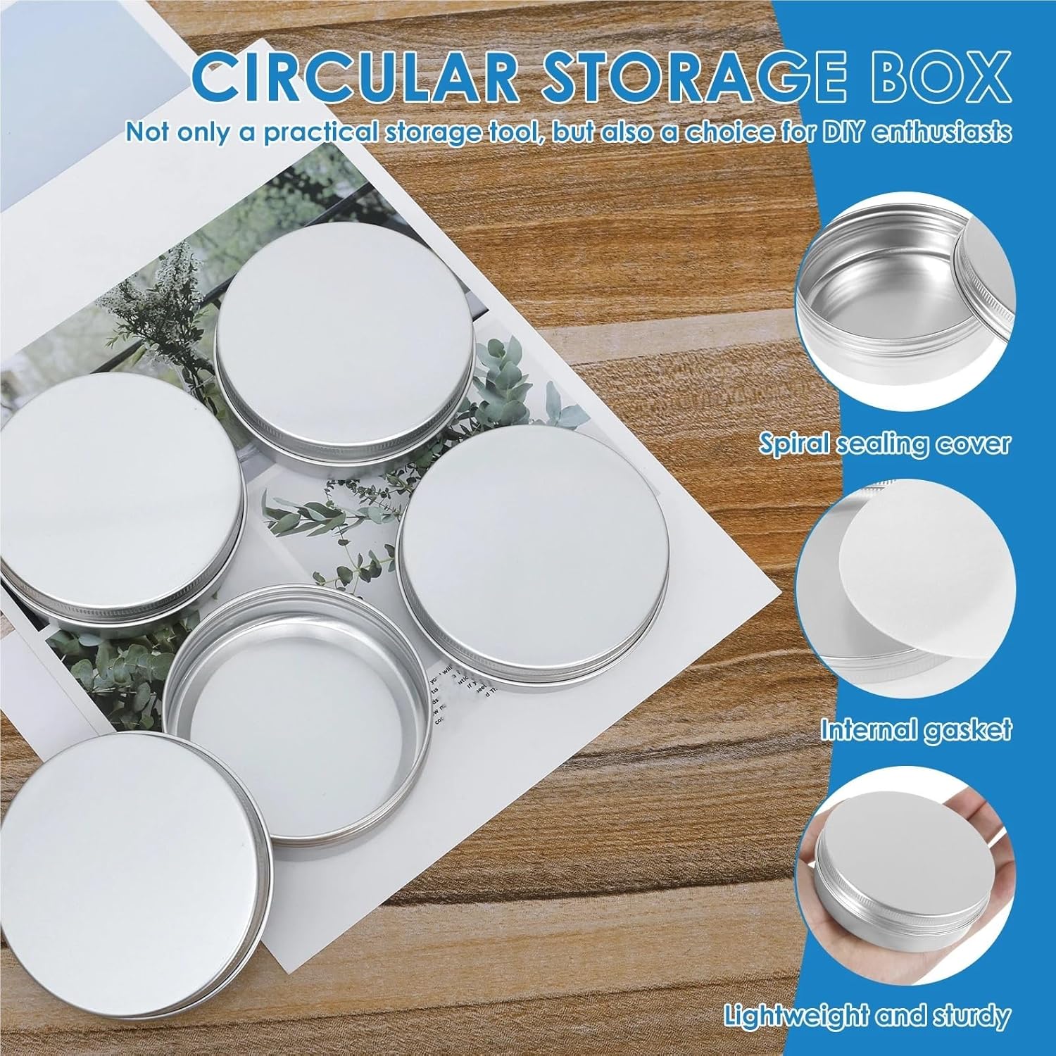 Easy to Clean and Built to Last: Smooth surfaces wipe clean in seconds, and durable construction means you'll find new uses for them year after yearFeatures:1) Quality Aluminum : This lip balm container is constructed of quality aluminum , which is lightweight and sturdy , suitable for carrying around and long lasting use2) DIY Container : This aluminum can is not only a practical container for storing , but also a choice for DIY enthusiasts to show off your creativity and talent , which can be used for weddings , anniversaries and parties , for storing items3) Screw Seal Lid : This lip balm tin is designed with a screw seal lid with internal gasket , which has excellent sealing performance and effectively stops the contents from leaking4) Wide Applications : Whether you want to store food , candy , coin , cosmetics , herbs and handicrafts , this small tin container can can meet your diverse needsSpecification:Product Name: Aluminum Tin JarTexture: AluminumSize: 50ML: 60x28mm100ML: 83 x 28 mm/3.27 x 1.1 in