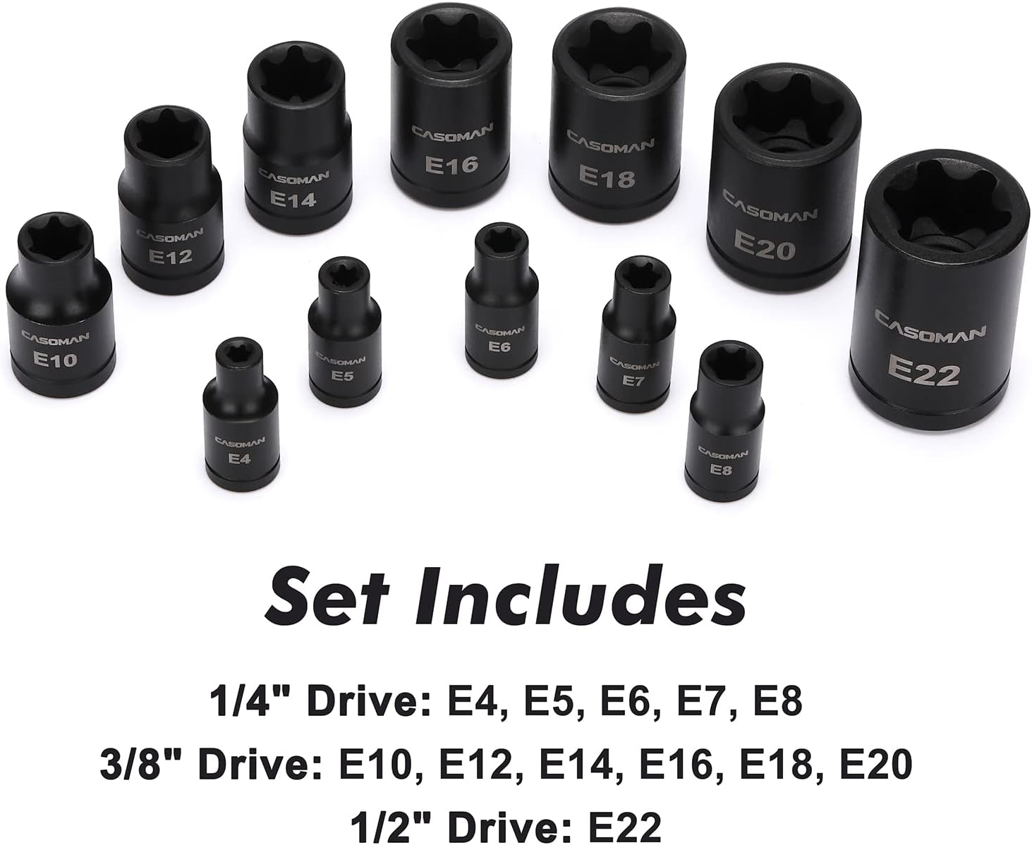 • Set includes: 12 Female E-Torx Sockets: 1/4" Drive: E4, E5, E6, E7, E8; 3/8” Drive: E10, E12, E14, E16, E18, E20 1/2” Drive: E22