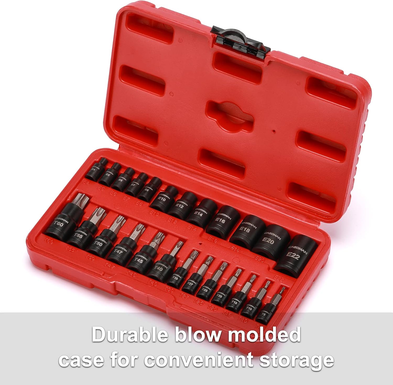 CASOMAN 25 Piece Torx Bit Socket and External Socket Set, 13 Star Socket Bits (T8- T60)& 12 Female E-Torx Sockets (E4-E22)