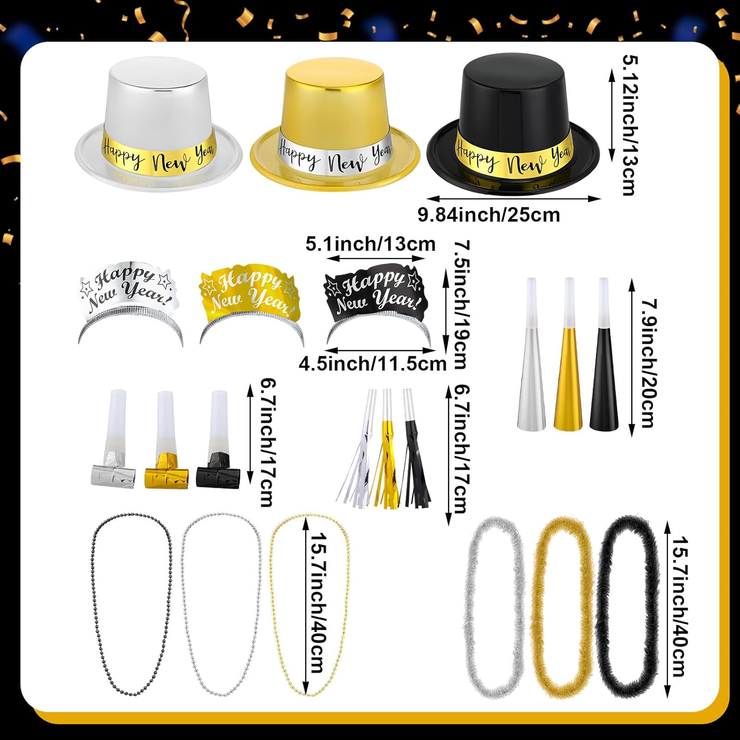 Features: New Year's Eve favors sets: you will get 126 pieces of New Year's Eve supplies, and serves 36 guests; Includes 18 pcs Happy New Year Top Hats with bands, 18 pcs Happy New Year glitter tiaras, 12 metallic fringed noise makers, 12 foil horns with white mouthpieces in assorted colors, 12 blowout noisemakers;36 pcs Happy New Year beads necklaces, 18 leis necklaces, adequate supplies will meet your decorations needs Sufficient pack: You can wear these beautiful New Year decorations with your relatives or adult friends, share the happiness of the new year together, and spend unforgettable times together. Hand out these New Year noisemakers as favors for all your guests and family to add some fun and cheer, Our glamorous New Year's Eve set will dress you up at your party with our cute gold, silver, and black must have accessories. Specifications: Material: plastic and paper Color: as the pictures show Size: as the pictures show Package: 18 x Cone hats 18 x Happy New Year tiaras 12 x Metallic fringed noise makers 12 x Metallic fringed noise makers 12 x Foil horns with white mouthpieces 36 x Party necklaces 18 x Leis Warm notes: Manual measurement, please allow slight errors on size. The color may exist slight difference due to different screen display