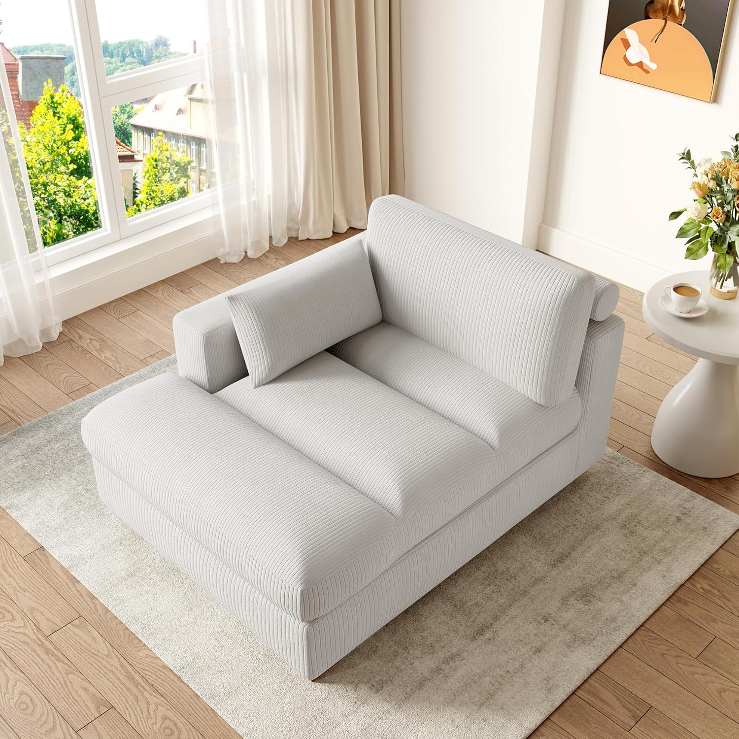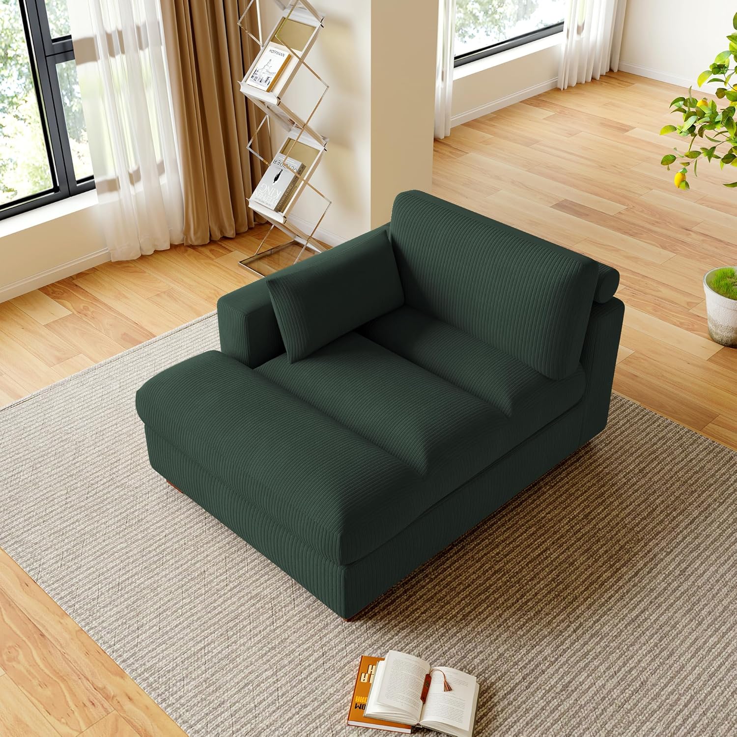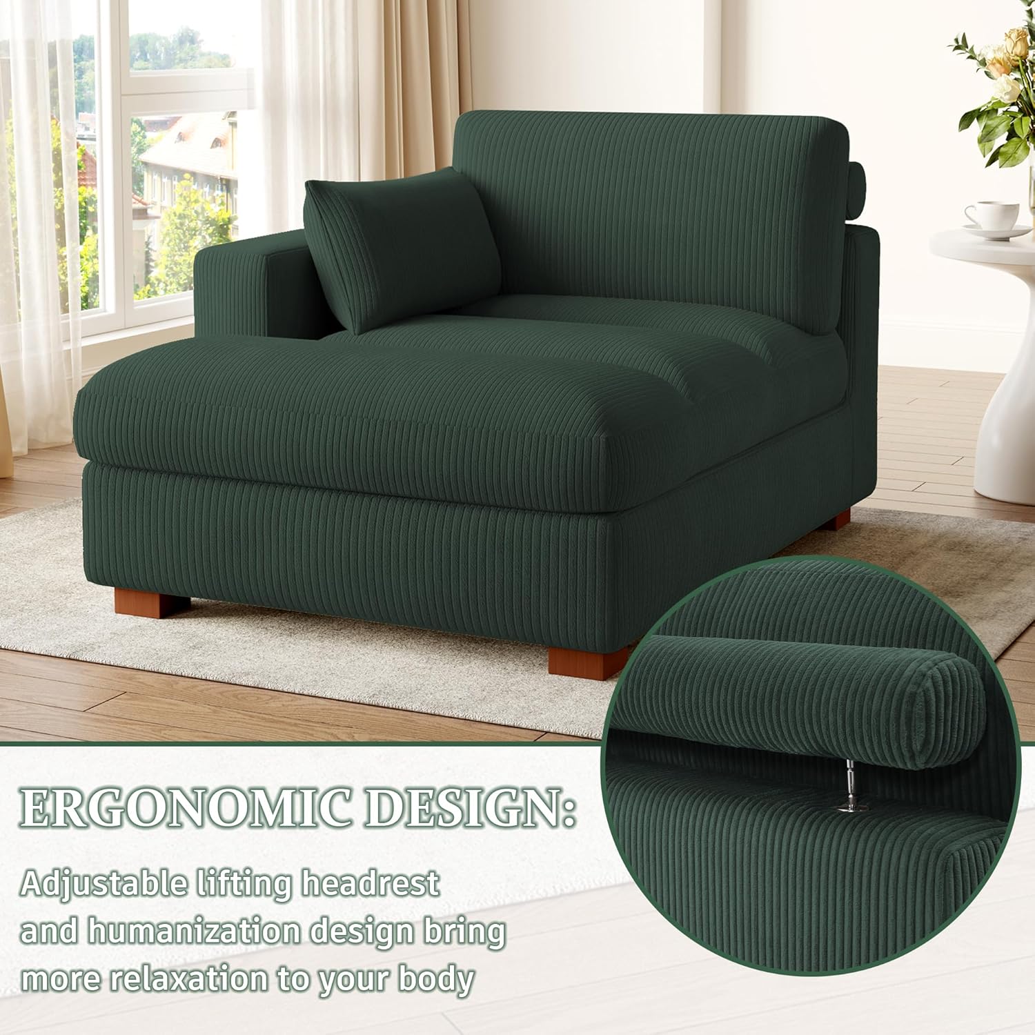 Chaise Lounge Indoor, Oversized Corduroy Sofa Chair with Right Armrest and Throw Pillows for Bedroom, Living room - Hunter Green