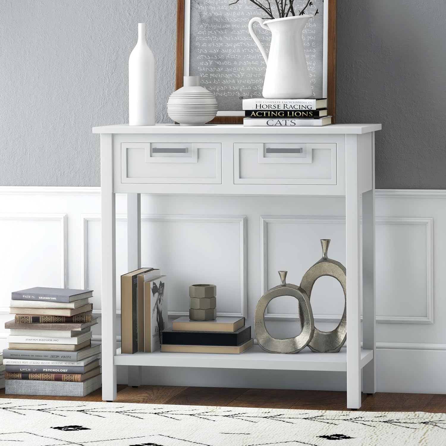DescriptionRevolutionize your living space with our extraordinary console table, the epitome of style and functionality. Whether you're seeking a chic hallway display, a sophisticated entryway organizer, or a striking accent in your living room, our sofa table is the answer to your dreams. With its convenient assembly process, you'll have this table set up in no time, allowing you to enjoy its benefits right away. The included anti-tip device ensures stability and safety, making it a reliable choice for households with children or pets.Not only does this table offer aesthetic appeal, but it also provides ample storage with its two spacious drawers. Keep your essentials organized and within reach, maintaining a clutter-free space.Order now and enjoy the benefits of an organized and elegant home.FeaturesAdjustable foot pads protect your floor from potential damageConstructed of solid wood and MDFCombination of drawers and open compartment offers convenient storage solutionsLarge capacity and durable material for practical useWidely used in entryway ,living room,bedrooms,office,etcElevate your home decor with classic design,making life organized and elegantThe clear product manual enables quick and easy installationSpecificationsColor:Black,Grey,WhiteMaterial:MDF &Rubber WoodOverall Dimensions:31.5”W*14”D*32”H/80cm x 35cm x 81.5cm (W x D x H)Load-bearing of tabletop:33lbs/15kgLoad bearing of shelf:11lbs/5kgTabletop Thickness:0.7”/18mmNet weight:24.7lbs/11.2kgPackage includes1 x black console table with drawers1 x instruction