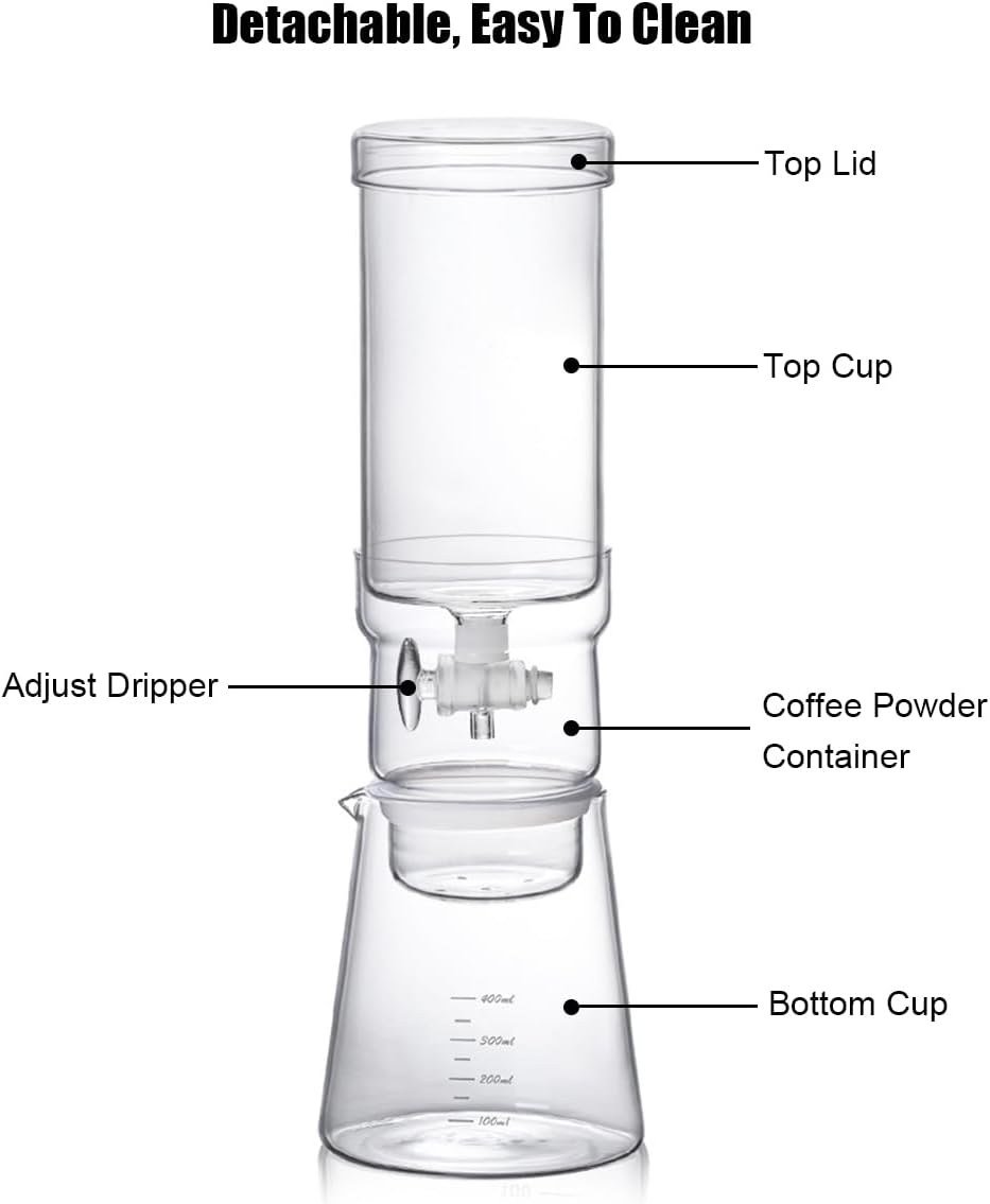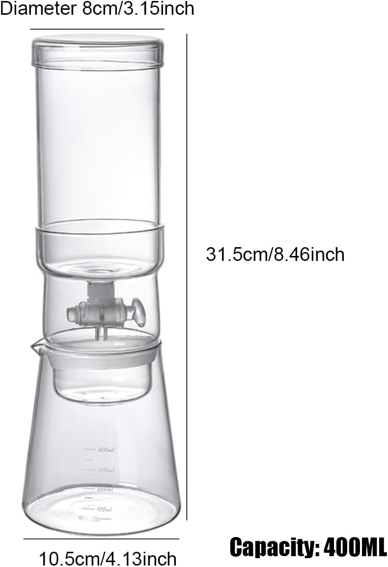 Description: Introducing our premium cold brew drip coffee maker to all coffee enthusiasts - a must-have! If you enjoy the rich and mellow flavor of cold brew coffee, this ice drip coffee pot is precisely what you need. Our cold drip coffee maker is specifically designed to create a refreshing cup of coffee for scorching summer days! How to use it? ① Put in the round filter paper ② Pour in the coffee powder ③ Attach the top cup to the bottom cup ④ Put ice cubes in the top cup and fill it with water ⑤ Regulate the dripper flow rate ⑥ Wait for 3-5 hours for extraction Specifications: Color: transparent Material: borosilicate glass Size: 8 * 31.5 * 10.5cm/3.15 * 8.46 * 4.13inch Temperature range: -15 ° C~ 115 ° C/5 ° F~ 239 ° F Capacity: 400ml/13.5oz Weight: 900g Usage: home, kitchen, cafe, bar, office Packing List: 1 * Cold drip coffee machine Note: * Please allow for slight variations in size due to manual measurement. * The pictures may not accurately reflect the actual color of the item due to differences between various monitors.