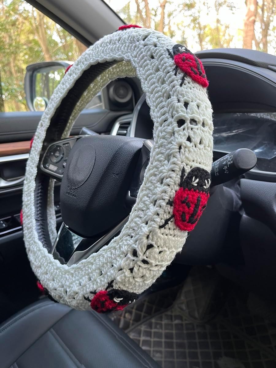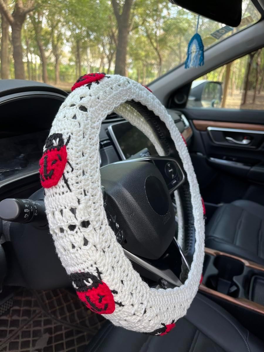 Handmade Crochet Ladybug Car Steering Wheel Cover,Ladybug Seatbelt Cover, Car Mirror Rainbow,Women Car Accessories crochet steering wheel cover is suitable for various car models and brands, such as sedans, SUVs, MPVs, etc. It not only adds a touch of style to your car, it is very lovely and cozy,fits a standard steering wheel 14-15in diameter. the seat belt covers with buttons attach those to your seat belts,make sure it's the right size for your car. Cute Car Mirror Hanging Handmade Crochet Rainbow after the Rain Interior Rear View Mirror, Women Car Accessories,Crochet Car Accessories, luxurious and eye catching,Perfect decor for your car,make your car unique.
