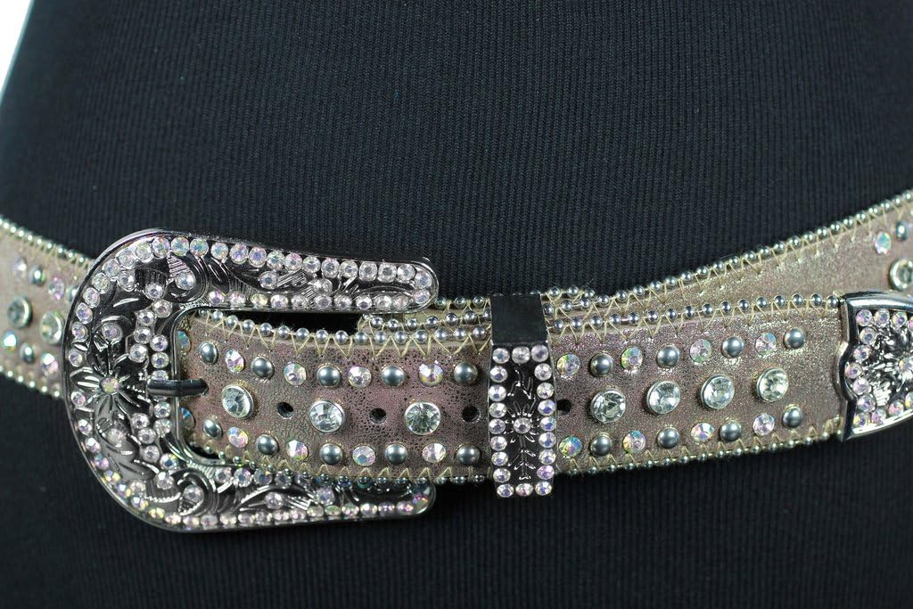 Wear it, love it, be unique and be elegant. Rhinestones and studs are ard in a pattern around the belt, with crisscross western Conchos spread evenly across. The included buckle and keeper are large silver with rhinestones and etched detailing. The look is completed with tiny beads sewn on either edge of the belt. The oversize buckle, it is covered in matching crystal colored rhinestones. The end of this belt is also done in solid rhinestone detail, and is also topped off with a large center crystal colored stone. Heavy Hardware; Small measures approximately 40 inches long, end to end. Medium 43 inches long, end to end. Large 46 inches long, end to end. X-Large 49 inches long, end to end. The middle hole to the end of the belt is 6 inches. Jeans Loop. Rhinestone Jeweled. Belt is 2.75 inches wide, at widest point. Belt is .25 inches thick.