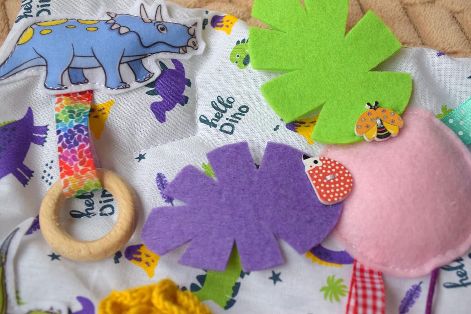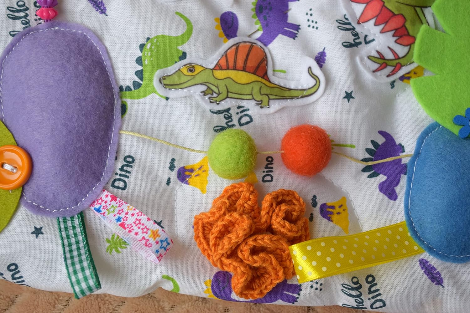 ♥♥ I present to you a wonderful Dinosaur blanket for children of any age. You can put your child on his knees or buttocks, so that he learns about the world, touches with his hands, develops grasping abilities, learns the range of colors, and learns tactile skills. Sensory elements will help to develop sensory perception. There are many playful possibilities on the mat, such as buttons, bells, ties, ribbons, pompoms, sequins and more. A child can develop tactile abilities thanks to different material surfaces: yarn, mesh, felt, wood, metal, plastic, fabric. It will be safe for the child to play on the mat, because there are no sharp and large parts. All parts are securely sewn, so you can not worry about the safety of your baby. The blanket is made of cotton. The mat is soft and warm, as the anti-allergenic filler is sewn inside. All details and accessories are 3d and made in bright colors. Colors and details may vary slightly as I create authentic toys. The size of the rug is - 34 cm * 45 cm / 13.3 inches * 17,7 inches. Washing: you can safely wash the rug in a washing machine or by hand at a temperature of 30 degrees Celsius (303 degrees Kelvin, 86 degrees Fahrenheit), drying in a tumble dryer is also possible. ♥♥ ATTENTION! The plastic toys near a blanket is not for selling! ♥♥