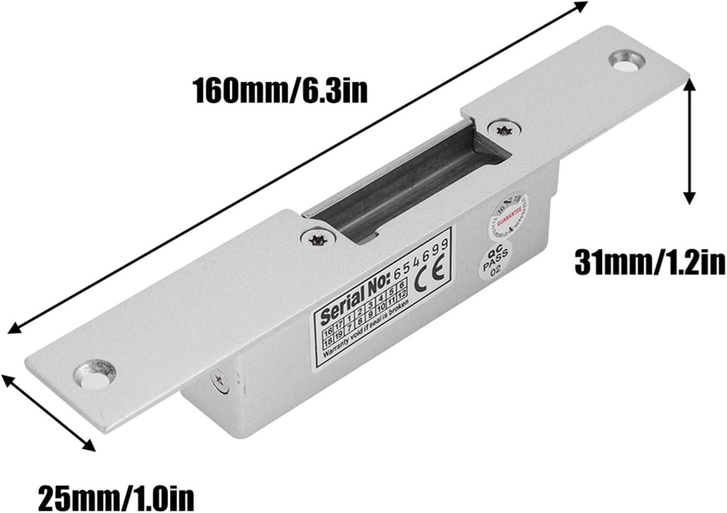 Specifications:Type: NC Electric Strike, NO Electric Strike (Optional)Material: stainless steelWithstand tension: 500kg thrustInput voltage: DC12VOperating current: 200mA (NO); 200mA (NC)Safety type: Power-off lock (NO); Power-off unlock (NC)Applicable door type: wooden door, metal door, PVC doorSurface temperature: below ambient temperature +20 °CApplicable temperature: -10~+55°CApplicable humidity: 0~95%Size: 160 * 25 * 31mm / 6.3 * 1.0 * 1.2inWeight: Approx. 289gPackage List: 1 * Lock1 * Screw Kit1 * Manual