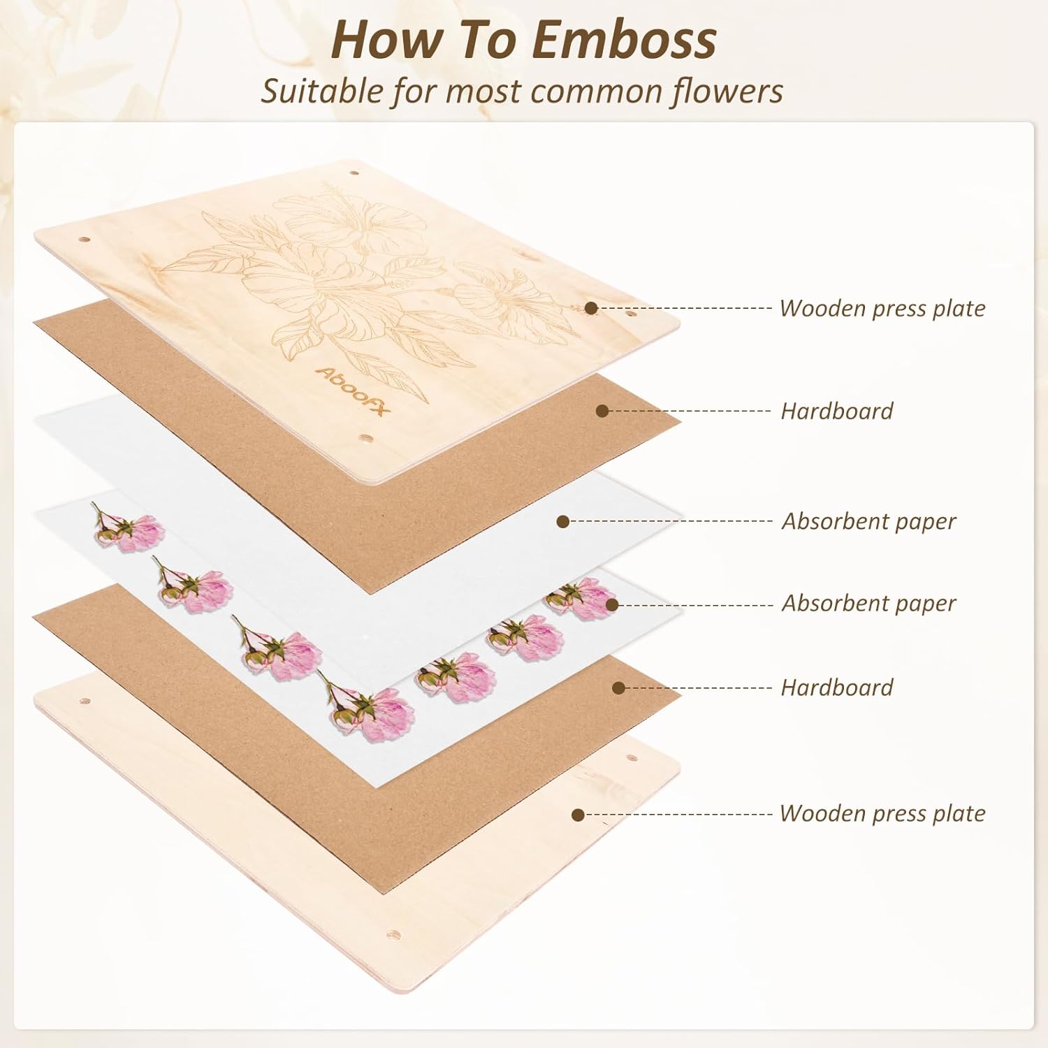 Product description Detailed description:Description:This wood flower pressing kit is beginner friendly , made of quality smooth wood and rust resistant hardware for long term use . Ideal for DIY pressed flower crafts and flower preservation , a perfect present for craft loversKey Features:Flower pressing relieves stress and boosts focus , a great relaxing hobby for adults , and a practical tool for parent child interaction and nature educationSpecification:Material: WoodColor: BurlywoodSize: 27.5×27.5cm (10.83×10.83in), Thickness: 5mm (0.20in)Note:1. There may be slight differences between the picture and the actual color of the commodity. We will try our best to show you the exact color2. Please allow slight dimension differences due to manual measurementParts List:2 x Wooden Pressing Boards 10 x Hardboards 24 x Blotting Paper Sheets 4 x Wing Nuts 4 x Bolts 8 x Washers 8 x Nuts 1 x Tweezer 1 x 7 Needle Tool 1 x Scissors 1 x Craft Knife 1 x Storage Bag Manufacturer Contact Information no