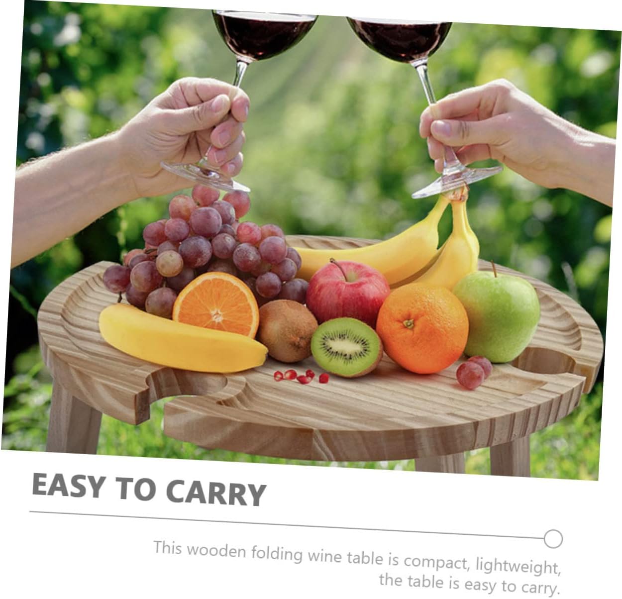Package List 1 x Camping Folding Table Features -Material: Wood Portable Table -Size: 30.00X30.00X15.70cm/11.79X11.79X6.17in Folding Desk -Color: Light Brown personal folding table -Can be used as red wine table, fruit wooden table, outdoor table, picnic dining table, multi-functional portable camping table. -With enough storage space, wood material, sturdy and safe to use table for beach. low table for picnic -The wine table is a must have for all wine lovers, giving them a comfortable and convenient using experience. travel picnic table -The whole appearance design of product is simple and generous, present to your friends camping dining table. - for outdoor wine festivals, family picnics, camping, beach or just a quiet evening in your backyard. sand tableGoods InformationPicnic Folding Desk This item is a table specially designed for storing wine, wine glasses or other food, with different storage areas on the surface, it can be used to hold your wine glass, snack dishes and wine bottle without easily falling off