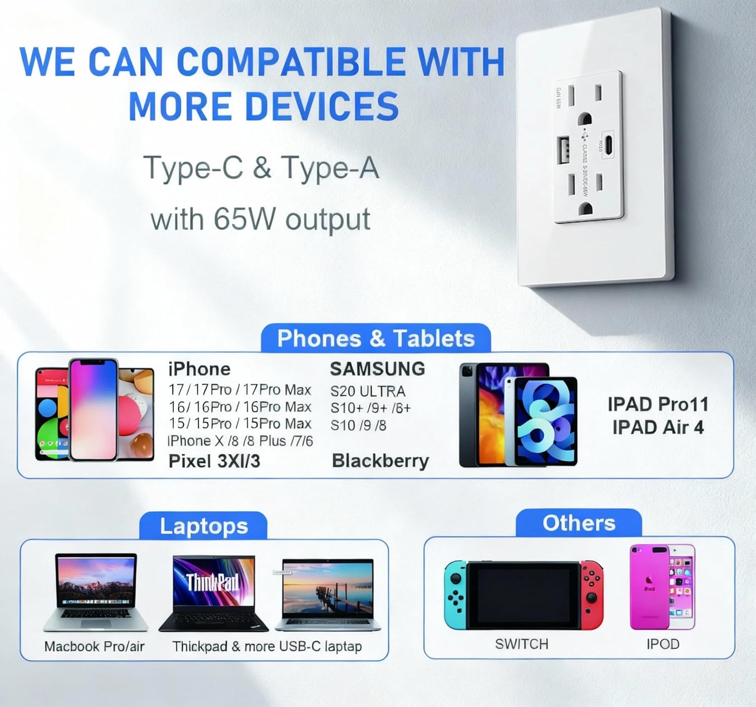Amerisense GaN 65W 6Amp 2-Port USB Wall Outlet, 15 Amp Tamper-Resistant Receptacle with 1 USB Type C & 1 Type A Port, USB Charger for USB-C Laptop/iPhone/LG, 2 Pack,UL Listed