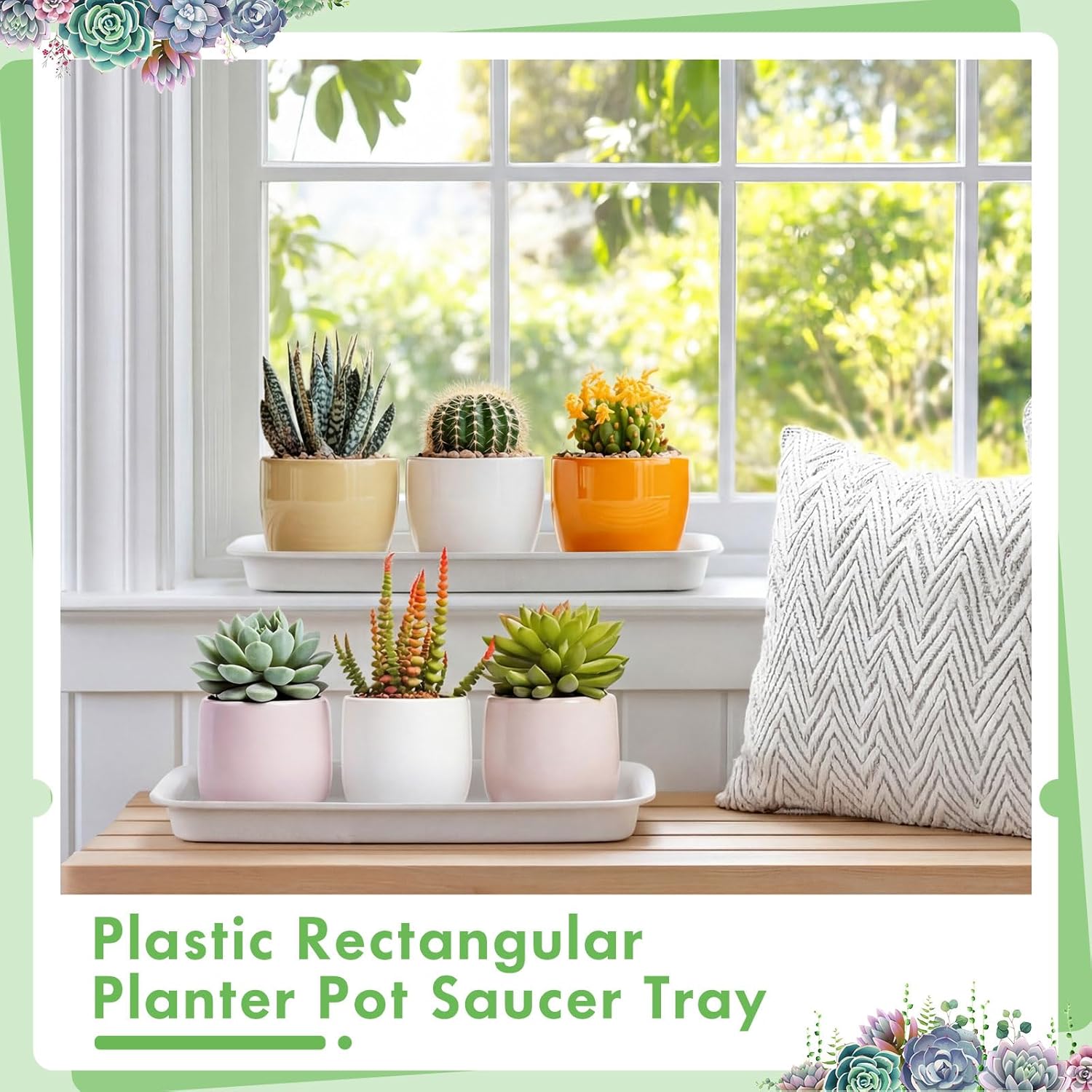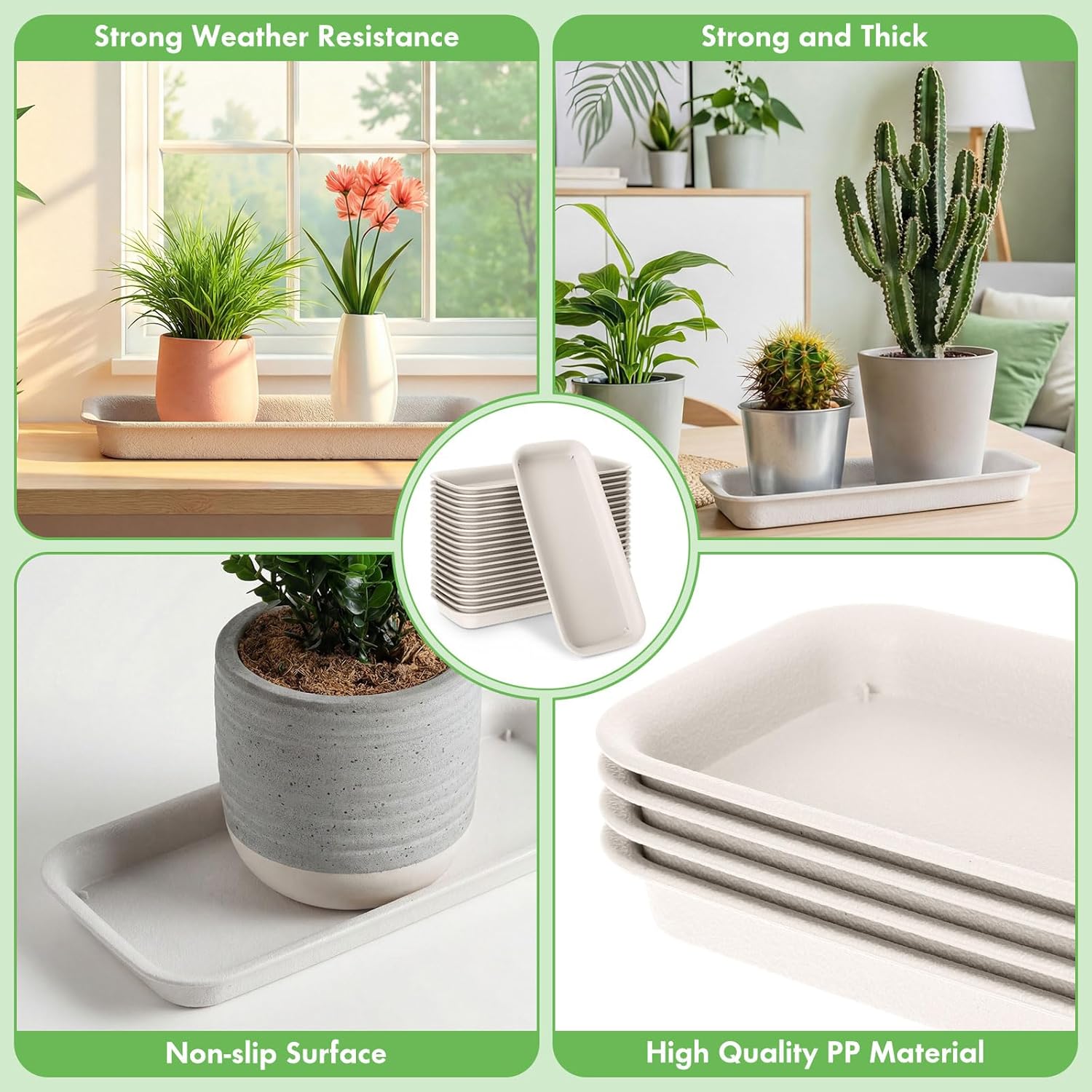 Features: Thickened And Durable The rectangular plant saucer tray is made of high-quality thick PP material, heavy duty, sturdy and durable, resistant to deformation or breakage, and capable of bearing heavier flower pots. Lightweight and durable, these window sill plant trays can withstand both indoor and outdoor environments Anti Slip Surface The rectangular window sill plant tray feature a non-slip frosted surface, making them suitable for use with ceramic, plastic, and other flower pots while providing both slip resistance and aesthetic appeal. The raised edges help collect excess water and soil overflow, so you don't have to worry about staining tabletops or carpets, creating a clean and tidy space for you Specifications: Material: PP plastic Color: creamy white Size: 11.8 x 5.3 x 1 Inch Package includes: 20 x plastic plant saucers trays Notes: Manual measurement, please allow slight errors on size. The color may exist a slight difference due to different screen displays