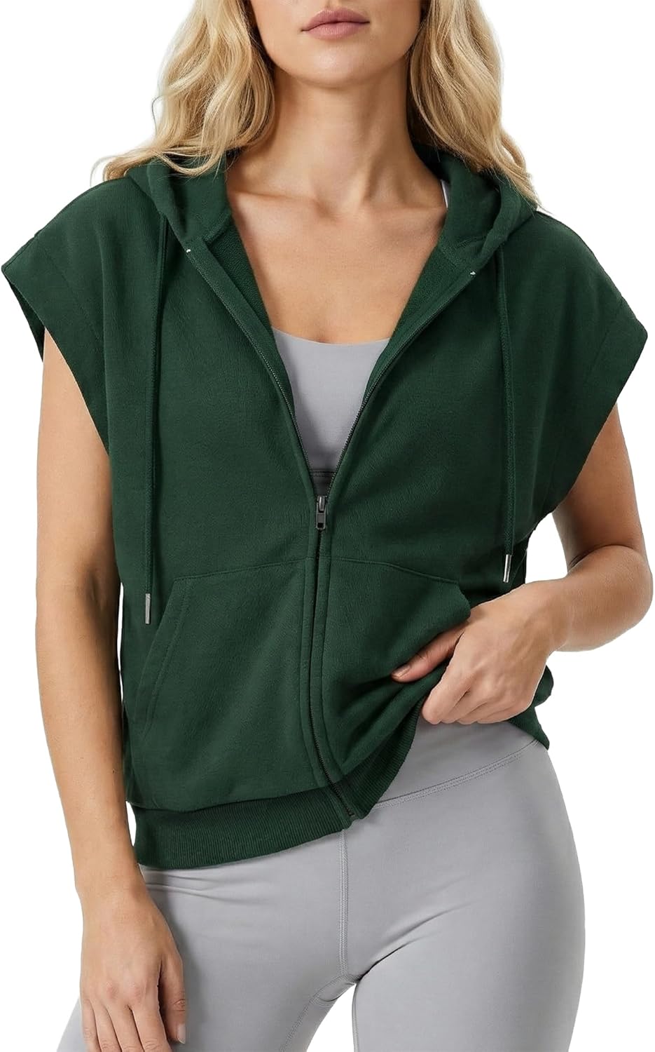 This women’s sleeveless hoodie features a clean, minimalist design with a hidden zipper for a smooth front look. Matching fabric and drawstring colors create a cohesive style. The semi-cropped length offers comfort without feeling too short, making it perfect for daily wear, yoga, running, or easy layering over a tee for a cute, casual outfit.