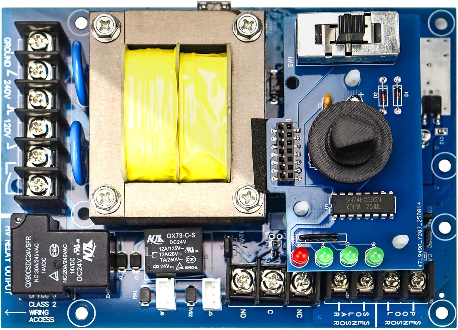 1. Intelligent Solar Water Heat Control for Pools Precisely regulates solar thermal energy for pools and spas with automatic differential temperature control. Optimizes solar heat collection while offering selectable modes for heating or nocturnal cooling, ensuring efficient solar hot water heater performance. Features programmable recirculation freeze protection and LED status indicators. 2. Advanced Temperature Control for Pool Systems Single-dial adjustment with calibrated 75°F–104°F range and "solar off" position. Includes selectable high-limit safety control and automatic valve actuation (12VAC/24VAC). Ideal as a pool heater controller for both residential and commercial setups. 3. Universal Pool Control Compatibility Direct replacement for Hayward models (GL-235, GL235, GLD-30-0065, GOLGL-235, 2807-101.). Supports 115VAC/240VAC high-voltage output (1HP/2HP) for pump control and integrates seamlessly with existing pool control systems. Jumper-selectable 12VAC/24VAC valve actuator compatibility. 4. Robust Solar-Powered Design Microprocessor-based PCB with OEM-grade manufacturing for reliability. 5. Smart Automation for Energy Efficiency Automatically switches between solar heating and cooling modes to maximize energy savings. Includes booster pump control options (SPST-NO isolated contacts) and real-time operation status via LED indicators.