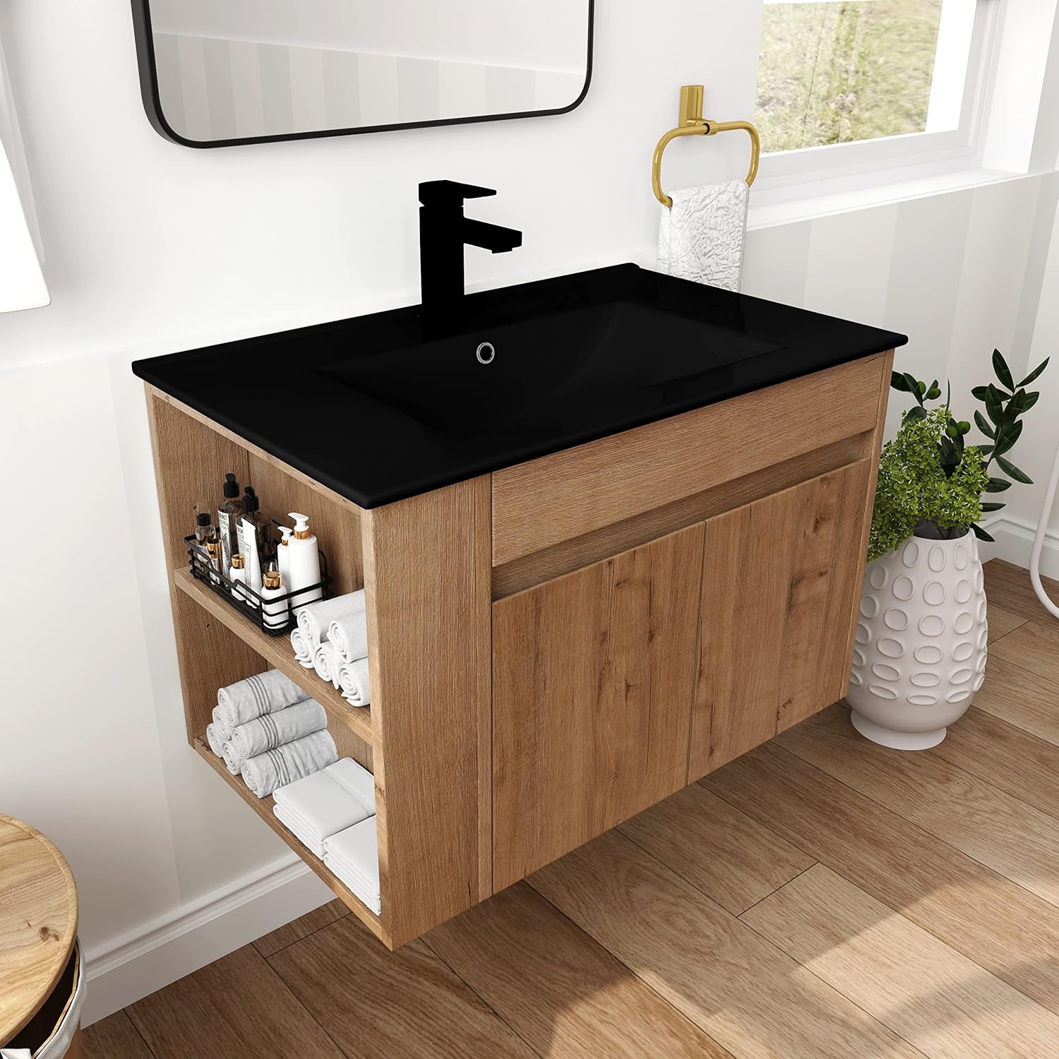 Wall Mounted Bathroom Vanity with Sink Dimensions: 31.5"L x 15.7"W x 20.9"H Net Weight: 56.5 lbs Cabinet Material: MDF Sink Material: Ceramic Number of packages: 2 Pacakge Include: 1 x Bathroom Vanity Cabinet 1 x Ceramic sink Note: Faucet and Mirror are not included