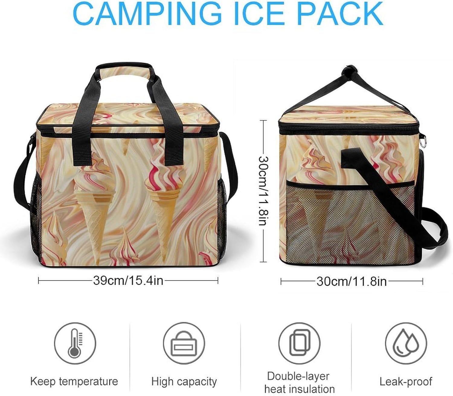 Take Your Meals Anywhere with Several Ice Cream Cones Grocery BagsFood Container Carrier Oxford Fabric Picnic Bag Heat Retaining Food Bag Camping Cooler BBQ Accessories Cute Picnic Bag with Pockets Insulated Food Bag for Work Insulated Lunch Tote Bag Camping BagTemperature Control That WorksThe upgraded aluminum foil lining creates an effective thermal barrier. Your drinks stay refreshingly cold, and your hot dishes maintain their warmth for hours. No more lukewarm meals during outdoor outings.Thoughtful Storage DesignTwo side mesh pockets - Perfect for water bottles or umbrellasFront zippered pocket - Keeps keys, phone, or condiments organizedInternal mesh pocket - Stores utensils, napkins, and small essentialsMain compartment - Spacious enough for food containers and snacksBuilt for Daily AdventuresConstructed from high-density oxford fabric with reinforced stitching at stress points. The double zippers are sturdy and smooth-operating. Reinforced handles let you carry heavy loads with confidence.Carry Your WayHandles for quick grabbingStands upright for easy packing and accessPerfect For:Picnics in the parkBeach days and pool partiesCamping and hiking tripsOutdoor concerts and festivalsDaily work lunchesGym and fitness classesRoad trips and travelGrocery shoppingSpecifications:Dimensions: 15.4 x 11.8 x 11.8 inchesMaterial: High-density Oxford fabricLining: Aluminum foil (insulated)Closure: Sturdy double zippersPockets: 2 side mesh, 1 front zipper, 1 internal meshCare: Hand wash or machine wash, do not bleachNote: Food containers and utensils shown in images are not included.