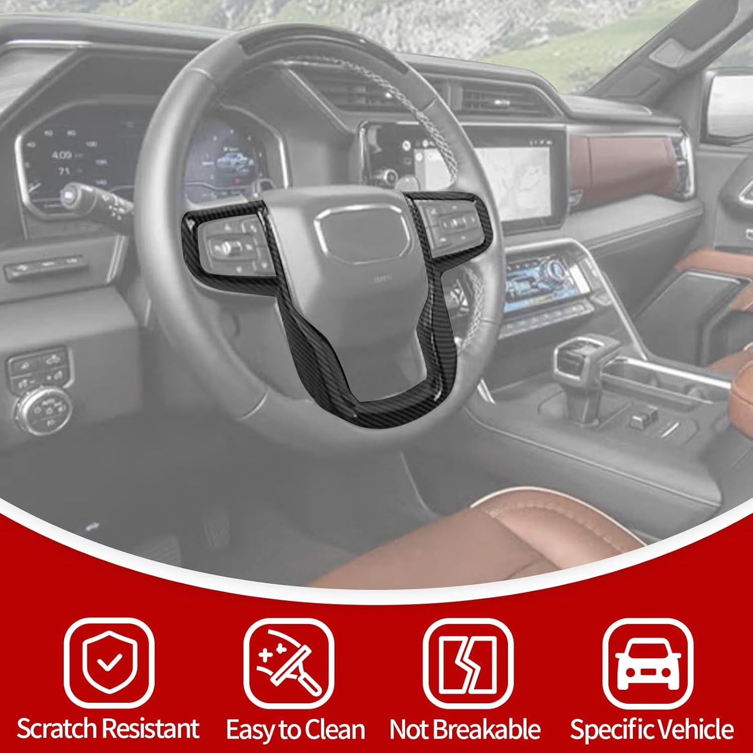 Fitment: - Compatible with GMC Sierra 1500 2019-2025 - Compatible with GMC Sierra 2500HD 2020-2024 - Compatible with GMC Sierra 3500HD 2020-2024 - Compatible with GMC Yukon 2021-2024 Features: - Easy to install - Made of durable ABS - Prevent your car from finger nails, keys scratches Installation Guide: - Step 1. Use rubbing alcohol to clean all the place where the decorative trim cover will be pasted. - Step 2. After the alcohol has dried, heat the tape with a lighter or blower. - Step 3. Paste the decoration cover in the corresponding position. - Step 4. Press the cover firmly into place. Package Included: - 1 x steering wheel trim