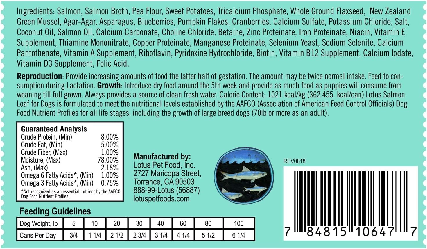 Give your pal the delicious, single-protein nutrition he needs with the Lotus Salmon Loaf Grain-Free Canned Dog Food. This grain-free loaf is made with real salmon as the first ingredient, with sweet potatoes, asparagus, blueberries, pumpkin and cranberries. Enhanced with essential vitamins, minerals, and antioxidants, it provides a complete and balanced diet for dogs of all ages. It also has superfoods like New Zealand green mussel, flaxseeds, plus salmon and coconut oils for a healthy skin and coat. Since it’s formulated with a single protein source and no carrageenan, guar gum or xanthan gum, it’s great for pups with sensitive tummies or IBS. Plus, it’s made in California, USA, with no grains, wheat, corn, soy, or anything artificial.