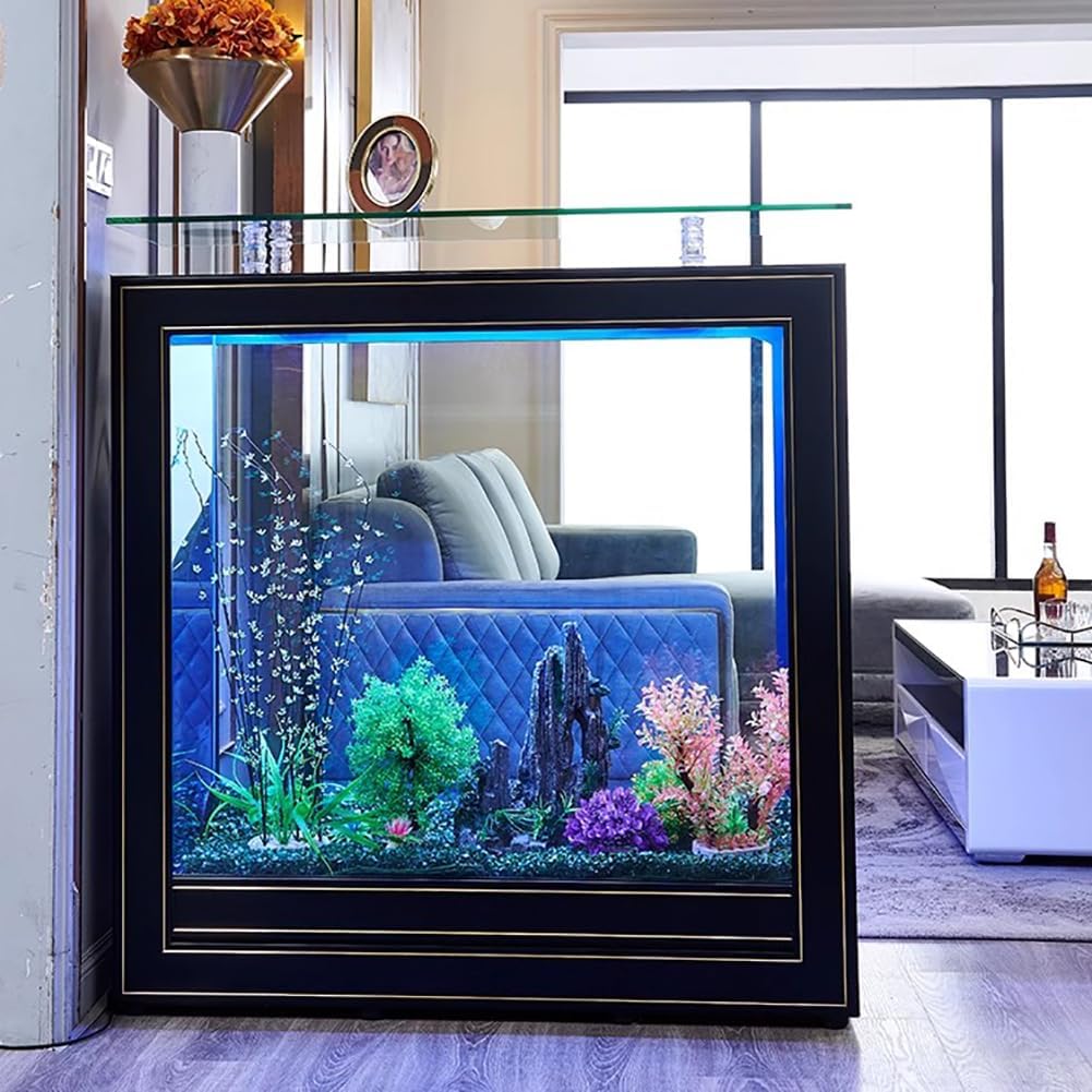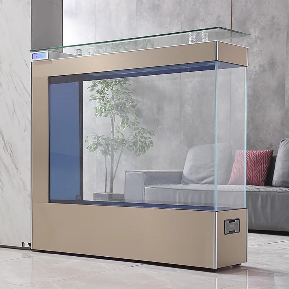Note: Does not include fish or real plants. You will receive a submersible pump, air pump, LED light, artificial aquatic plants, plant clips, aquarium brush, fish net, professional aquarium salt, filter cotton, ceramic rings, air stone, and an all-in-one aquarium, making you a professional fishkeeper. Our aquarium features multi-stage filtration for clearer water, effectively removing impurities and purifying the water. It improves water quality, stabilizes pH, and accelerates the formation of an ecological filtration system. A one-button side/bottom drain makes cleaning easier.Colors: White, Gray, Black, Champagne GoldMaterial: Acrylic + GlassVoltage: 110-220VPower: 40WDimensions: 80/100/120/150*35*128CMWeight: 100-180kgPackage Contents: Aquarium *1