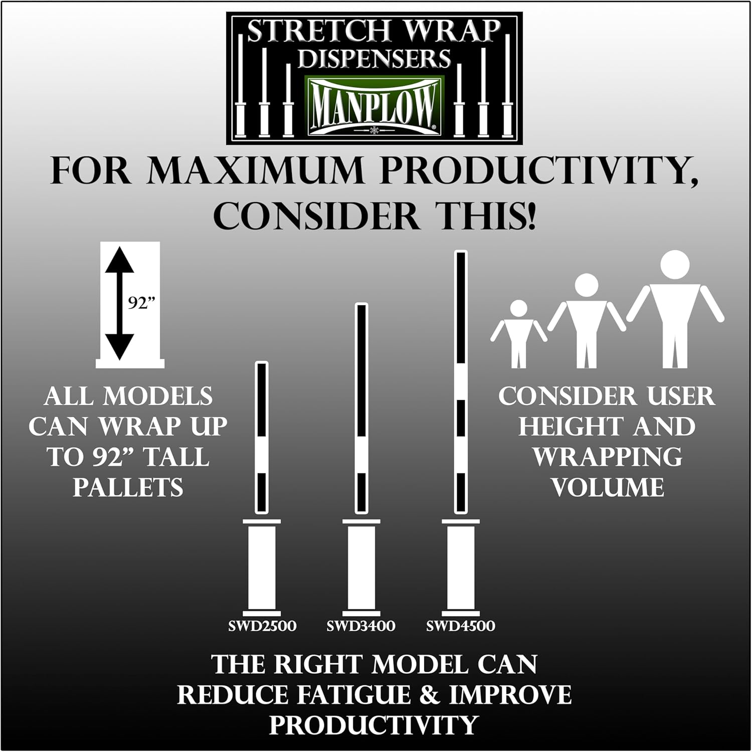 The longer handle provides more hand separation to increase leverage and reduce fatigue. When you are wrapping more than 5 pallets a day, you will experience the best results with the SWD3400. Set down your MANPLOW where you want, not where you can. All models feature the StandUp Base that allows your MANPLOW to be set down on any flat surface and remain up right. The StandUp Base also offers a lower profile so it can wrap less than an inch from the floor; securing your freight more securely to the pallet. Remember the MANPLOW Promise; Wrap the Bottom, Middle and Top without walking backwards, bending over or over reaching.