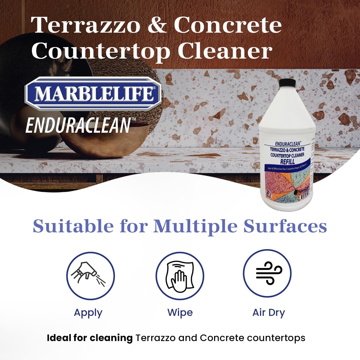 Introducing our top-rated heavy-duty concrete and terrazzo countertop cleaner, a powerful solution for all your kitchen and counters around the grill. This product is designed to effectively clean and brighten your countertops. Leaves your home's greasy areas looking spotless. For stains, our cleaner white formula lifts oils, dirt and waxes from the surface. Try it today and experience the difference a clean countertop can make to your home! Comes in a practical 32 oz spray bottle. Refills are available, too.