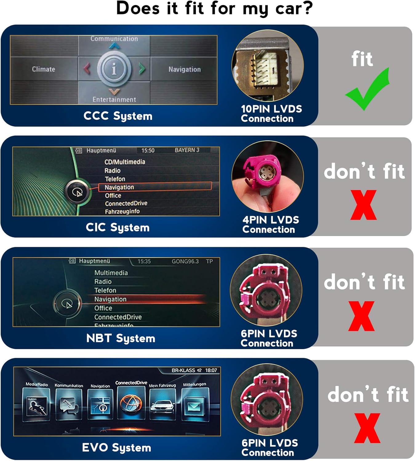 NOTE:Please make sure there is an AUX-IN port in your car.If there is no AUX-IN port in your car, please contact us to purchase FM transmitter, or it would be no sound after installation.The 4G function doesn't work in the Americas area (US, Canada, etc.) though there is a SIM slot inside the unit.Applicable Models & YearsFor BMW X5 E70 (2007 - 2010) with CCC systemFor BMW X6 E71 (2007 - 2010) with CCC systemFeatures:1920*720 with big screen. Upgrades your driving experience with supersized entertainment.G + G capacitive touch screen,Allows the touch to be highly sensitive while achieving scratchproof.IPS Panel, 178°Viewing Angle,Enjoy viewing on a big screen stereo without eye fatigue from any angle.Supports playing 4K format video.Split-Screen Mode,Listening music in Spotify while navigating, or making phone call with your browser open.Amplifier System ,Retains original fiber optical sound system for Harman Kardon.Transmit more data with improved speed and greater range.Screen Mirroring Function, Access your phone’s navi, music, and other apps from this unit.Dual Wi-Fi Band Connecting,Work with both 2.4 and 5GHz. Be ready for new generation of 5G Wi-Fi network.GPS Navigation