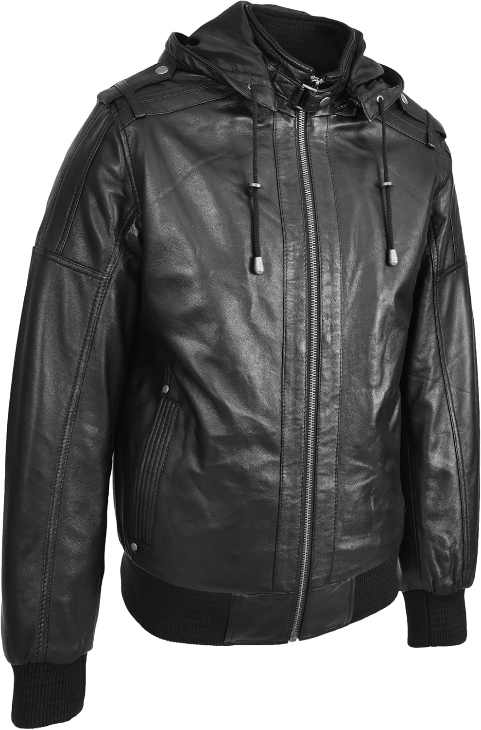 This rugged yet stylish mens leather jacket boasts a bomber-style design, crafted from genuine soft sheep nappa leather. It features a removable hood, two front zip pockets, two inside pockets, and a mobile phone pocket. The full zip opening, ribbed cuffs, and waist ensure a perfect fit, making it a practical and timeless addition to any wardrobe. Make a statement with this piece from House of Leather.