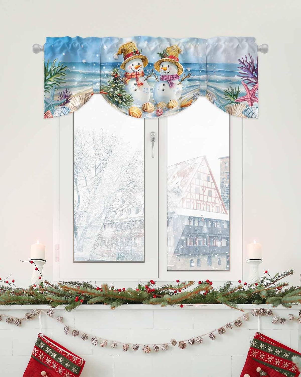 Christmas Tie Up Valances for Windows, Window Valances for Kitchen Bathroom Living Room Bedroom Farmhouse Material: 100% polyester Christmas Themed Patterns:Merry Christmas Cute Beach Snowman Snowflake Blue Sea Shells 4 Sizes for Choice 54x18in(137x45cm) 42x12in(107x30cm) 42x18in(107x45cm) 60x18in(152x45cm) Adjustable Valance Curtains There are straps on both sides of the valance, which can adjust the shape of the curtain. The wavy shape will make the curtain looks more elegant. Easy to Care Machine washable, low iron, do not bleach.