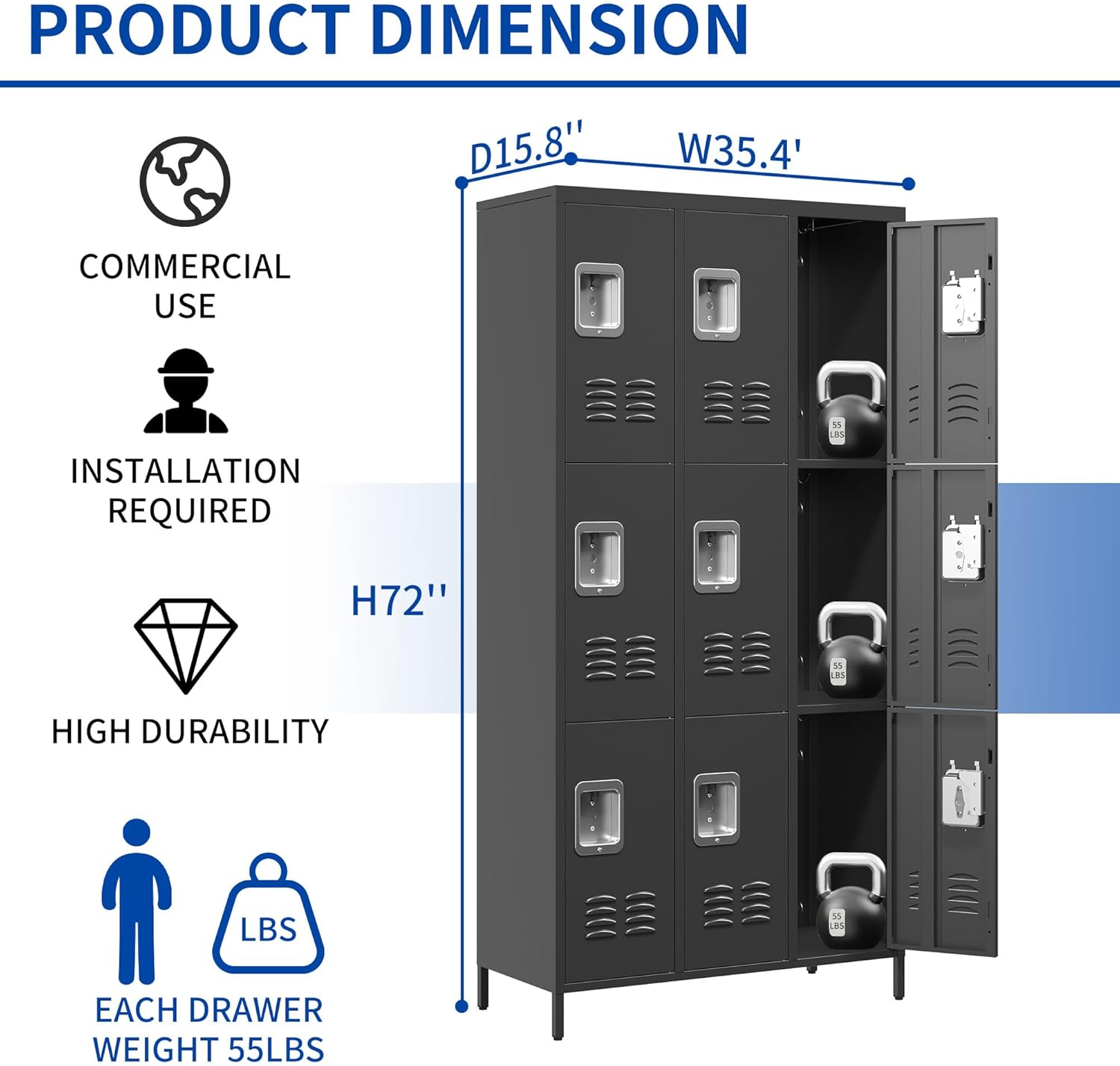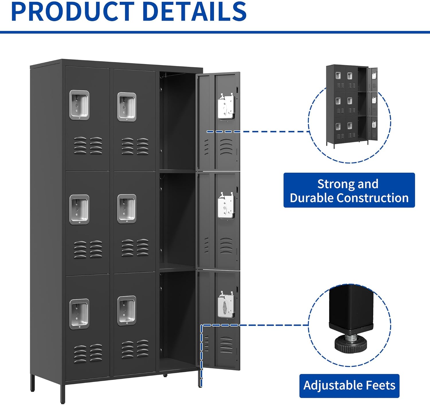 HIGH QUALITY - Crafted from premium steel, our metal employees locker promises top-notch quality. Electrostatic spraying on all metal plates ensures resistance to corrosion from moist air. Experience durability that stands the test of time.ENHANCED SECURITY - Rest easy knowing the doors are constructed with thickened steel, offering robustness and damage resistance. Each door can be individually locked, providing secure storage for your items.MULTI PURPOSE - Embrace the minimalist design of the entire metal cabinet, making it an ideal fit for various spaces, including gym rooms, bedrooms, classrooms, porches, and dressing rooms.FAIRLY EASY TO ASSEMBLE - While assembly is required, the process is straightforward. Our Metal Storage Locker comes with comprehensive installation instructions and a guidance video, ensuring a hassle-free setup experience.Transform any space into an organized haven today with our Metal Storage Locker - your key to spaciousness, quality, security, and versatility. Perfect for homes, offices, schools, and more!