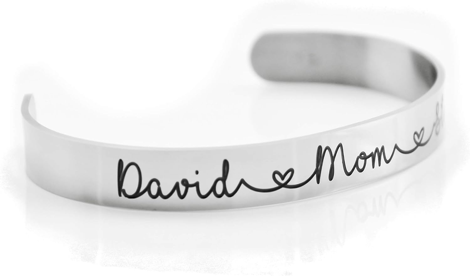 Personalized name bracelet. Bracelet with names 3/8 inch stainless steel cuff bracelet with names of choice” Cuff is 6 inches long and adjustable Our cuffs are a bright silver tone and made of Stainless steel, which is safe on your skin. There is a much lower rate of skin reaction with stainless steel than with silver. They will not tarnish, fade or change colors. Our bracelets are lightweight, but very sturdy and are sure to become your new favorite accessory. If you have any special request or questions please do not hesitate to message me. We love custom orders! Thanks for stopping by Branded Heart Jewelry! Please checkout the other beautiful items in my shop