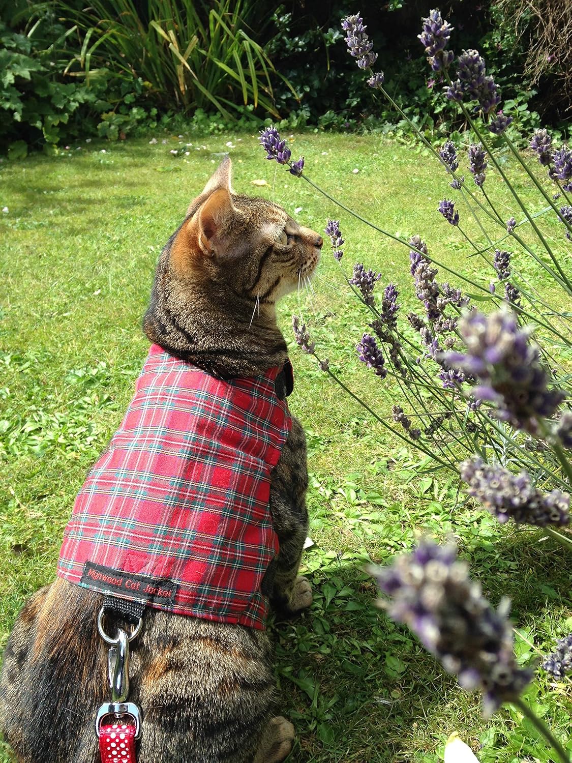 My name is Maria, I live in the Scottish Highlands from Yorkshire and I am the designer of the original escape proof cat jacket/harnesses. I make each of my cat jackets by hand, made to measure, from quality materials. I am a proud owner of 2 Bengals; Otis and Sherlock, and a Maine Coon; Barney who keeps the others on their toes! I soon realised that the many harnesses on the market were not secure and not feline escape proof. Cats were easily escaping from them by simply 'reversing' out of them. While developing my design, I did a lot of research. My design incorporates opinions and feedback from cat breeders and other owners. My design fulfils the 6 main aims for success: 1) Security, 2) Strength, 3) Practicality, 4) Design, 5) Comfort, 6) Customer satisfaction It fastens securely around the neck and chest with long strips of velcro. My jackets are extremely durable, triple sewn for strength, hard wearing and machine washable. They are easy and quick to put on and adjust to your cat. They have a super secure welded steel D-ring with extra reinforced stitching to attach your lead to go for walkies. Please never leave your cat unattended outside. My jackets are not designed for the cat to be left outside unattended whilst attached to something. Although I cannot guarantee that my jackets are totally escape proof I have worked to get them to be as close as possible. It is important to ensure correct snug fit and that training is completed before embarking outside.
