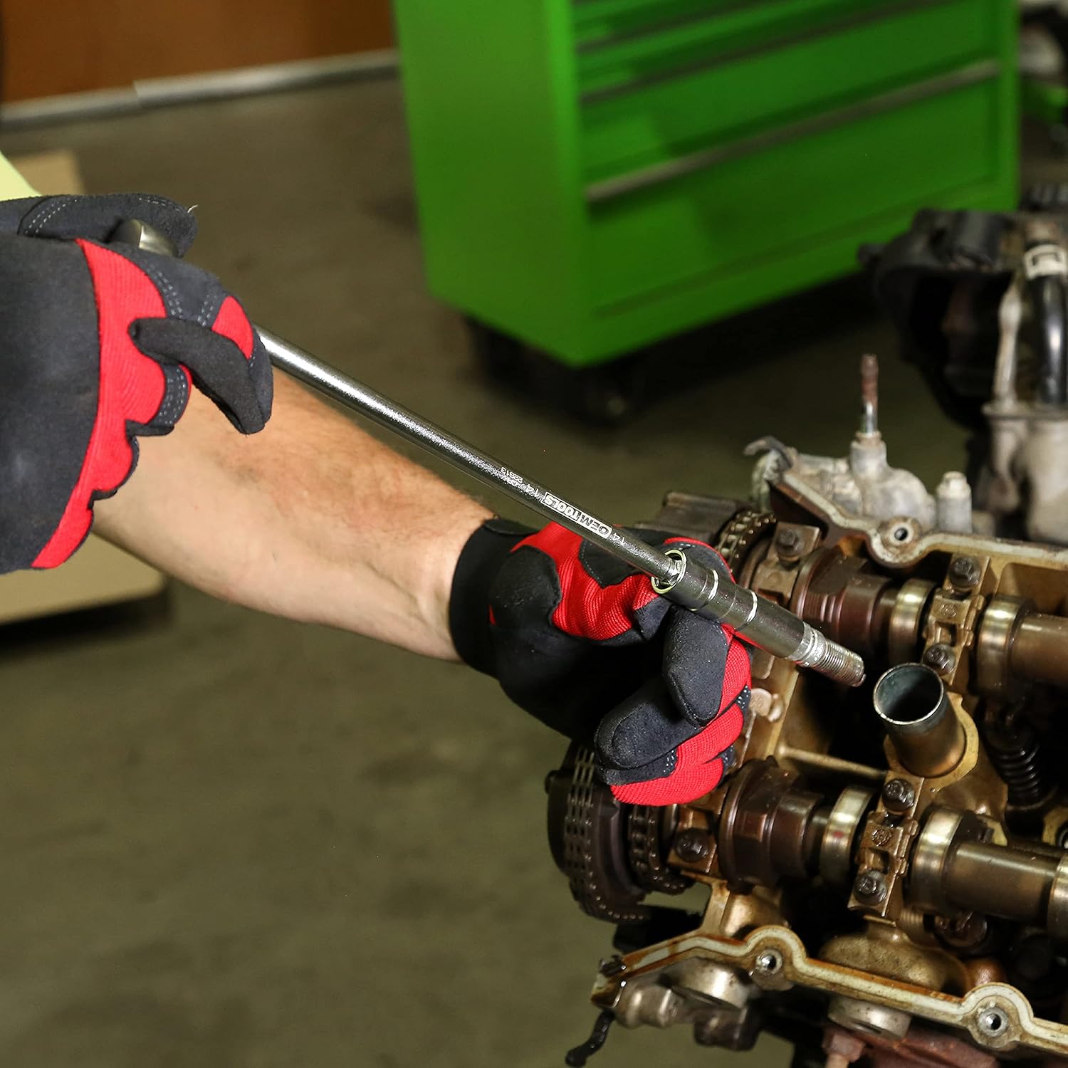 The OEMTOOLS 22911 3/8 Inch Drive Ratchet ( 8 Inch) and 3/8 Drive 14 MM 12 pt. Spark Plug Socket (12" Extension) is built for precision work in tight spaces. Applications include BMW N54, N55, and N63; Mercedes-Benz E90; Mini Coopers and Infiniti. Its 36-tooth gear mechanism provides a 10° arc swing, allowing for controlled movement in automotive repairs, machinery maintenance, and DIY projects. The one-hand reversing lever makes switching between tightening and loosening fast and easy. Made from heat-treated alloy steel, this long handle 3/8 ratchet is built to last, while the Hard Chrome finish resists corrosion and is easy to clean. A sealed ratchet head keeps dirt and debris out, ensuring long-term performance in garages, workshops, and industrial settings. The low-profile design allows for easy access in confined areas like engine bays and dashboards. Whether you're a professional mechanic or a home DIYer, this quarter-inch drive ratchet provides durability, precision, and reliability for your toughest tasks.