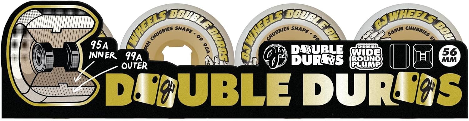OJ's Double Duro White/Gum Chubbies, 99a/95a, 54mm, blend the advantages of top 99a and 95a formulas, absorbing rough terrain while maintaining 99a urethane's speed and slide. The new Chubbies shape boasts a wide riding surface for optimal slides, with large, rounded radial edges for smooth curb, ledge, and edge transitions. They're wide, round, and plump.