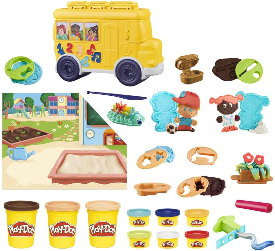| Included Components | Double-sided tablecloth, 6 cutters, decoration tool with rail, Includes baking mould such as school bus, stamps for boys and girls, Picnic basket, rolling pin, knife and 9 cans of Play-Doh modelling clay (net weight 510 grams), Worm tool, tool for creating a flower garden, |