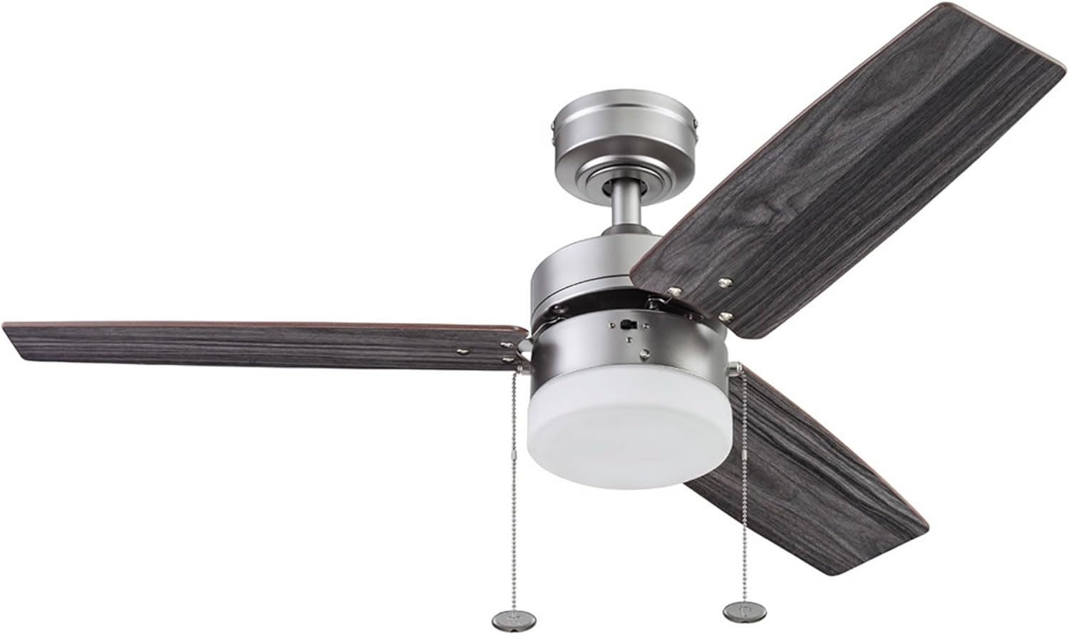 The 42-inch Prominence Home Reston is a clean-cut contemporary ceiling fan perfect for modernizing your spaces. The sleek pewter finish paired with gray cedar/ light oak reversible blades bodes well with coastal and modern farmhouse decor. Its gleaming cylindrical body houses an integrated white frosted globe light adding simplicity to style while providing dimmable LED illumination to your indoor areas. The quiet, reversible motor and design provide adjustable air movement that is ultra-efficient whether you want to cool down on those sweltering summer days or circulate warm air in the cold months of winter. To ensure your long-term satisfaction, this fan is backed by a limited lifetime warranty. The Prominence Home Reston gives you all the quality functions you deserve while providing the impressive eye-catching style you crave.