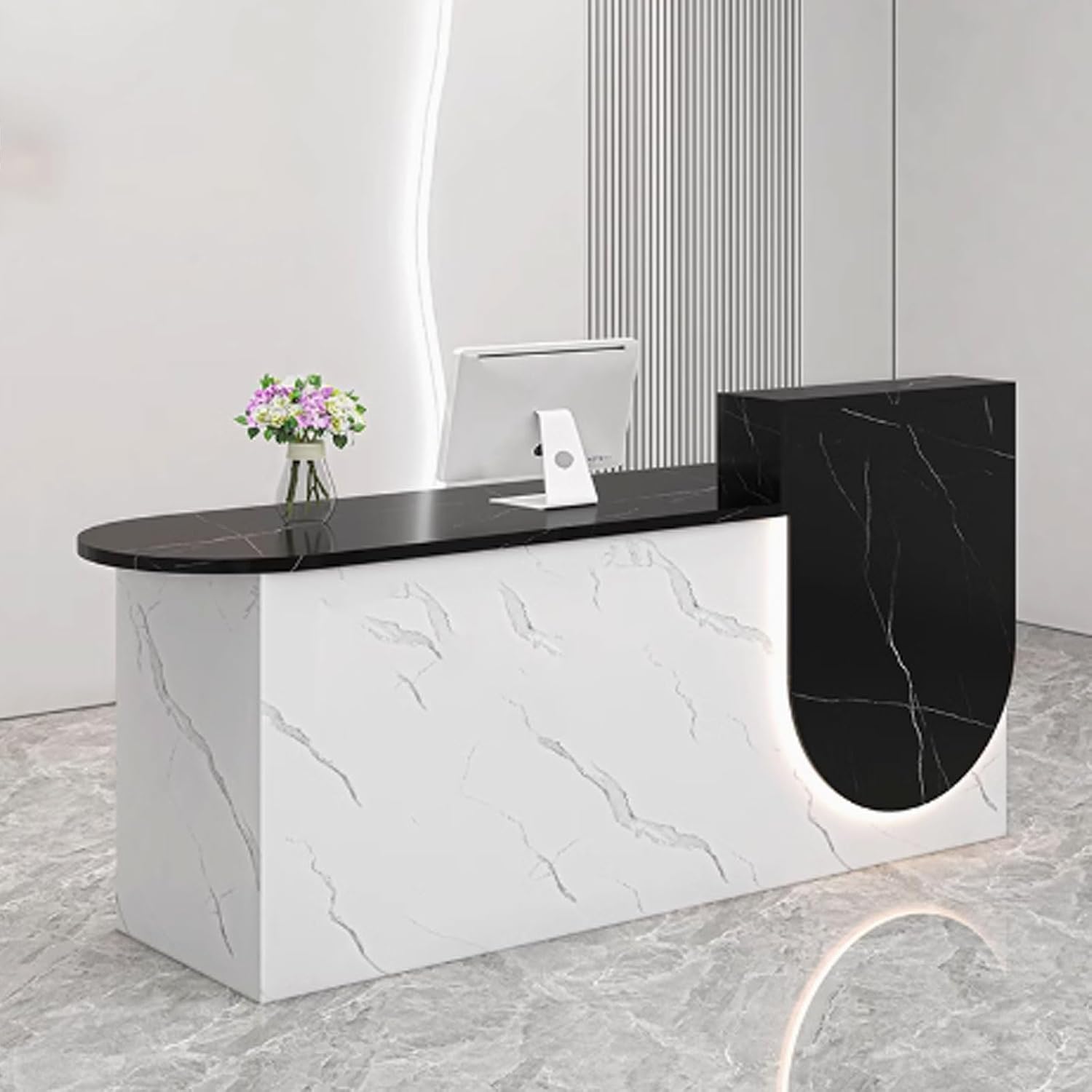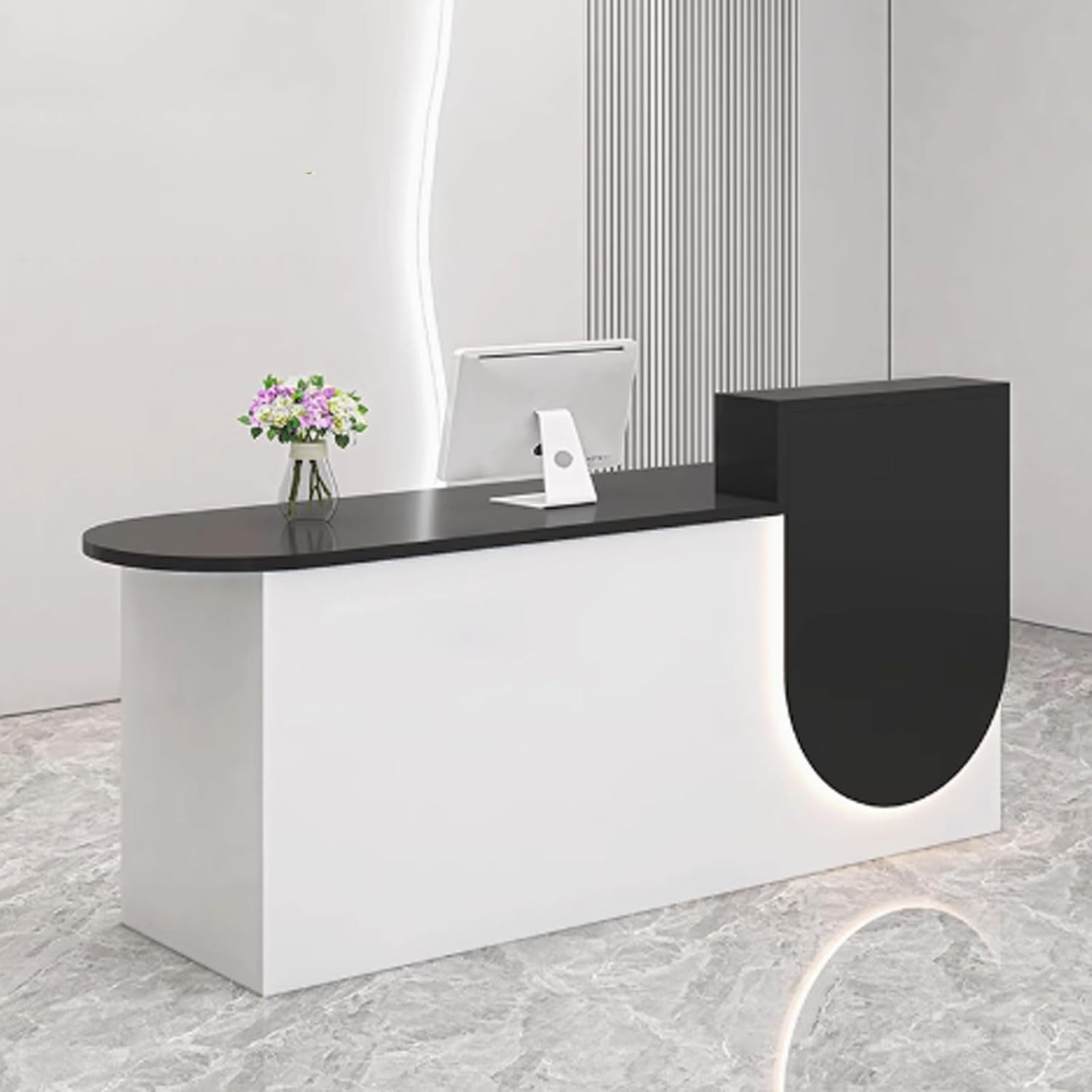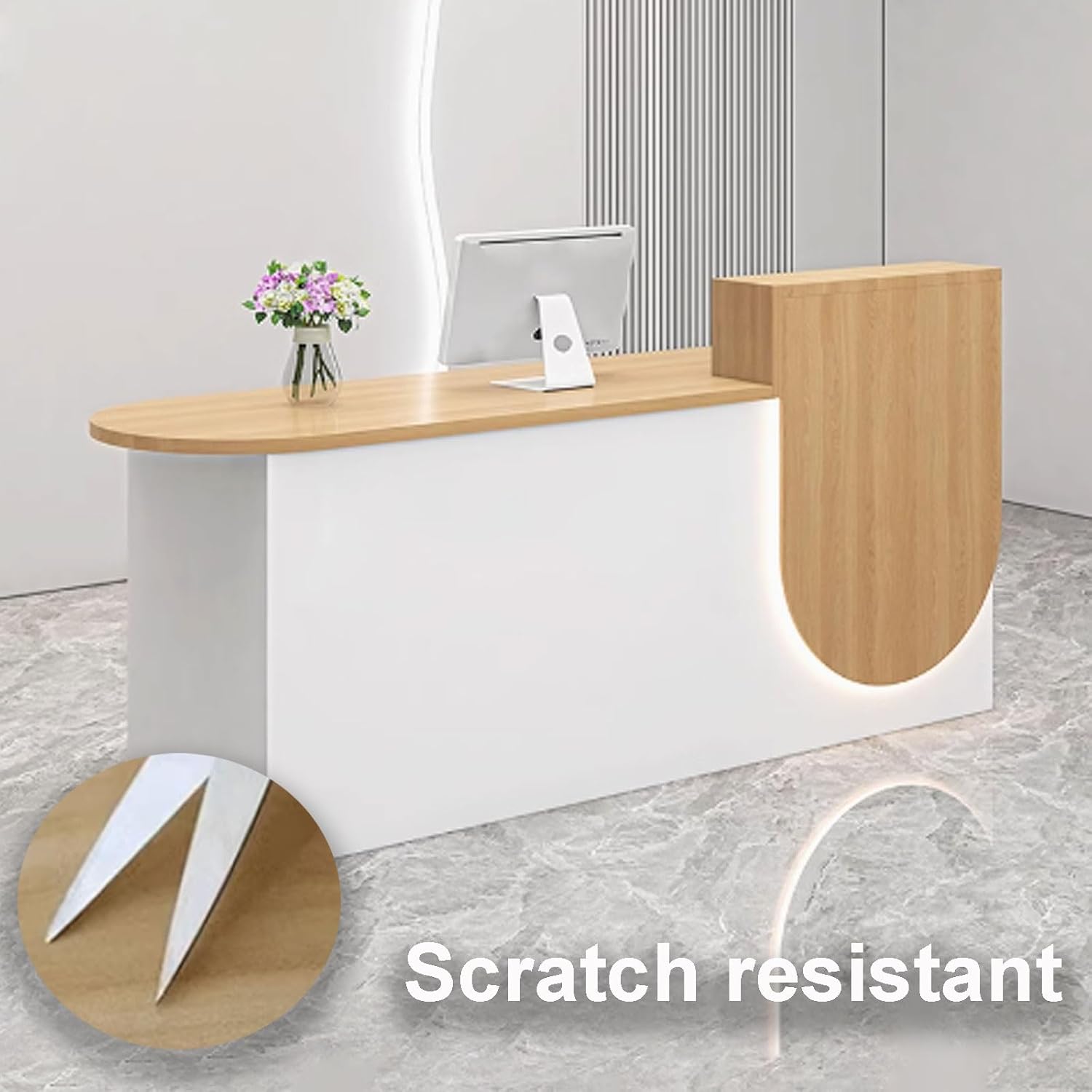 GUQASDV receptionist desk for salon will be a helpful solution to keep your work essentials organized and your workspace neat in reception area to improve work efficiency and create high-end sense to the scenesRounded corners: the corners are polished rounded and fine to avoid accidental injuries, reception desk with counter will not make hurts easily even for kidsApplication: business furniture reception desk counter is not only suitable for business reception area or lobby, but also can be used as a retail checkout counter for an array of establishments, including barber shops, supermarkets, clothing stores, restaurants, beauty salons and moreMaterial: Engineered WoodLights: LED light stripsColor: white texture, white + blue, white + orange, white texture + black texture, white, white + black, white + beige, gray texture + white texture, white + natural, beige, black, white + graySize: 100x55x100cm, 110x55x100cm, 120x55x100cm, 130x55x100cm, 140x55x100cmNote: 01 There may be a 3-5cm error in manual measurement which is normal, please understand02 Due to different displays or shooting environments, the product may have color differences, please understand