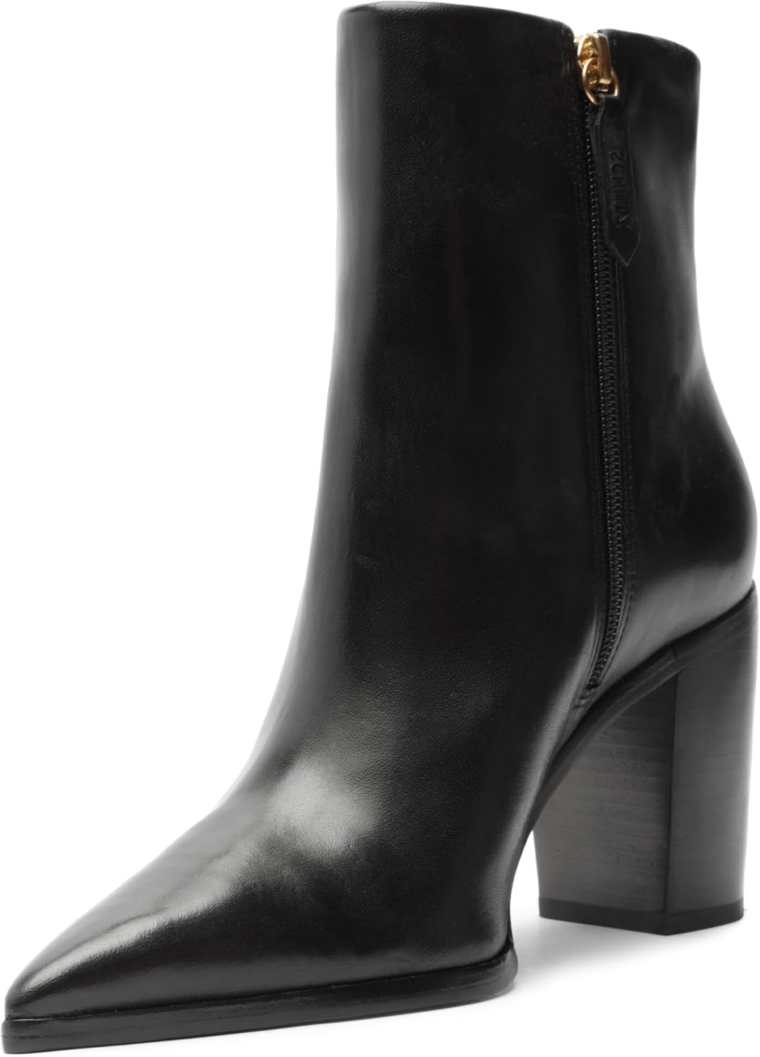The Mikki block-heeled bootie features a sleek, modern design with a pointed toe, giving it a sharp and elegant look. The boot is crafted from smooth leather with a polished finish that enhances its stylish appeal. The block heel provides stability and comfort, making it suitable for casual and professional settings. The boot extends just above the ankle, making it versatile for pairing with various outfits, from jeans to dresses.